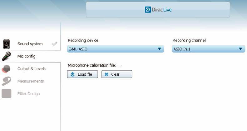 Sulla prima pagina "Sound System" si seleziona la configurazione del sistema, la scheda audio di riproduzione del segnale test e la frequenza di campionamento per la quale desideriamo creare i filtri, possiamo scegliere tra 44.100, 48.000, 88.200 e 96.000 Hz in modo tale che qualsiasi sia la frequenza di campionamento scelta ci sia il filtro adatto. La nuova versione della Suite Dirac che uscirà a breve (ci sarà un aggiornamento gratuito per chi lo acquista adesso o per chi lo ha già acquistato un anno fa) avrà il supporto per le frequenze sino a 192 kHz. Si prosegue in cascata dal menu a sinistra per accedere alla seconda pagina, riguardante la configurazione del microfono. Qui viene richiesto di selezionare il dispositivo e canale di registrazione, dopodiché si carica il file di calibrazione del microfono, nel caso della demo un XTZ Audio. Ovviamente si può usare qualsiasi microfono.