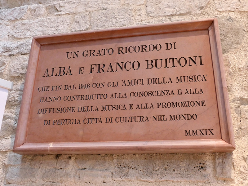 Purtroppo sono andati perduti i monumenti e le cappelle, mentre la facciata policroma è stata ripristinata nel suo antico splendore dall'architetto Pietro Angelini, nel 1926. Il tempo scorre, negli anni trenta e sessanta del Novecento il tempio sconsacrato è stato internamente demolito e solo all'inizio del 2000 è stato intrapreso un radicale restauro che lo ha portato a essere attualmente un "odeon", progettista originario dell'impresa Bruno Signorini. La chiesa è stata tra le prime in Italia a essere costruita dopo la morte di San Francesco, acquisendo nel corso dei secoli una rimarchevole rilevanza politica, sociale e artistica nelle vicende locali. Coraggiosamente, incuranti dei gravi pericoli strutturali, le grandi famiglie perugine la elessero a luogo privilegiato di sepoltura dei propri membri, lo stesso avvenne per capitani, giuristi e letterati che avevano onorato con la loro attività il capoluogo umbro. Notevole è la sua capienza di posti a sedere, ben 510, suddivisi in tre settori modulabili. Nell'enorme sala vedo un corposo numero di sedute (la maggioranza) di fronte al palcoscenico e altre due serie, più piccole, disposte nelle ali laterali. Il palcoscenico è stato installato su una struttura fissa, rialzata rispetto alla quota della platea.