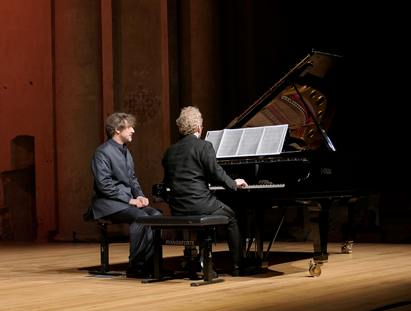 Un recital oscillante tra fattezze oniriche e muscolose declamazioni, protagonisti due artisti che fanno onore al nostro Paese: Francesco Libetta e Luca Ciammarughi. Quanto mai variegato il programma (e non è la solita formula retorica), con autori i cui dati anagrafici sono compresi tra il 1683 e il 1981, quasi tre secoli di musica che obbligano a temerari salti tecnico/stilistici, superati con impressionante "nonchalance". Come giustamente ha affermato Anton Giulio Onofri nella sua presentazione, Libetta e Ciammarughi sono due pianisti molto differenti tra loro, anche se la definizione di "pianista" nel loro caso sembra stare parecchio stretta. Guardando da vicino i rispettivi curricula, sappiamo che Libetta è anche compositore, direttore d'orchestra, scrittore, direttore artistico, docente e anche attore. Si, in una piccola ma significativa parte di garzone del bar nel film "Musikanten" (2005) di Franco Battiato, il compianto musicista con cui ha collaborato anche successivamente. Tra le sue capacità c'è anche quella, se non ricordo male, di pittore. Non soffre certo di complessi d'inferiorità in tal senso Ciammarughi, oltre che pianista scrittore (anche di note di sala per il Teatro alla Scala e l'Accademia Nazionale di Santa Cecilia), conduttore radiofonico, compositore, conferenziere e instancabile divulgatore.