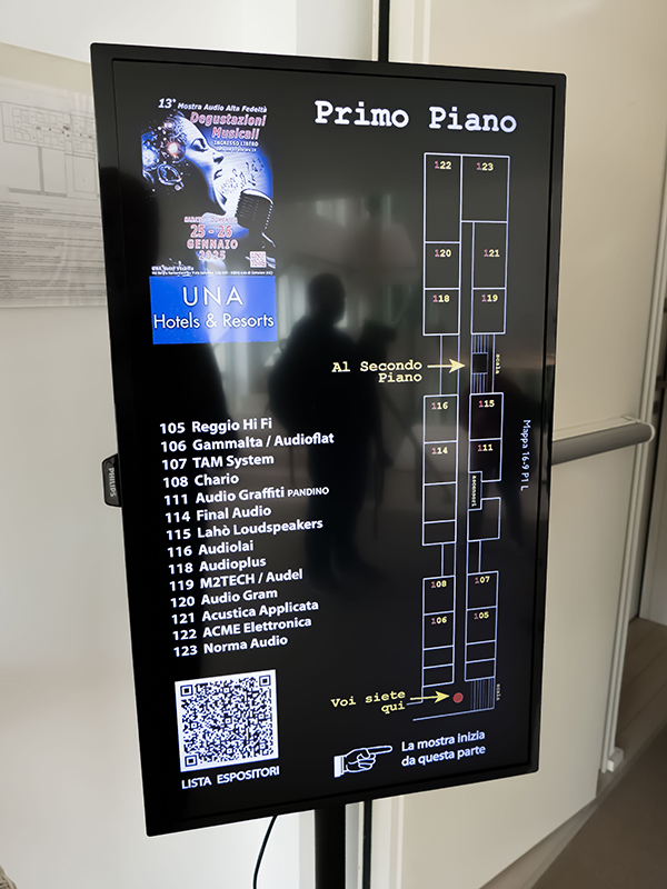 Si sale al primo piano del lussuoso Hotel Versilia Lido/UNA Esperienze, incontrando Reggio HiFi, un bel negozio che apre inizialmente nel 2018 a Chiozza, piccola località del Comune di Scandiano, a pochi chilometri da Reggio Emilia, su iniziativa di Paolo Codeluppi, appassionato da sempre di musica e alta fedeltà. Dal giugno 2024 si è poi trasferita nell'attuale sede di Reggio, nel cuore dell'Emilia. Dimostrava un interessante impianto formato dalle sorgenti Streamer Str@mbo e Str@mbo DUE, preamplificatore/DAC Nuprime DAC-9X, amplificatore finale di potenza Classe A+D Nuprime STA-9X e diffusori Goldenear BRX Reference X.