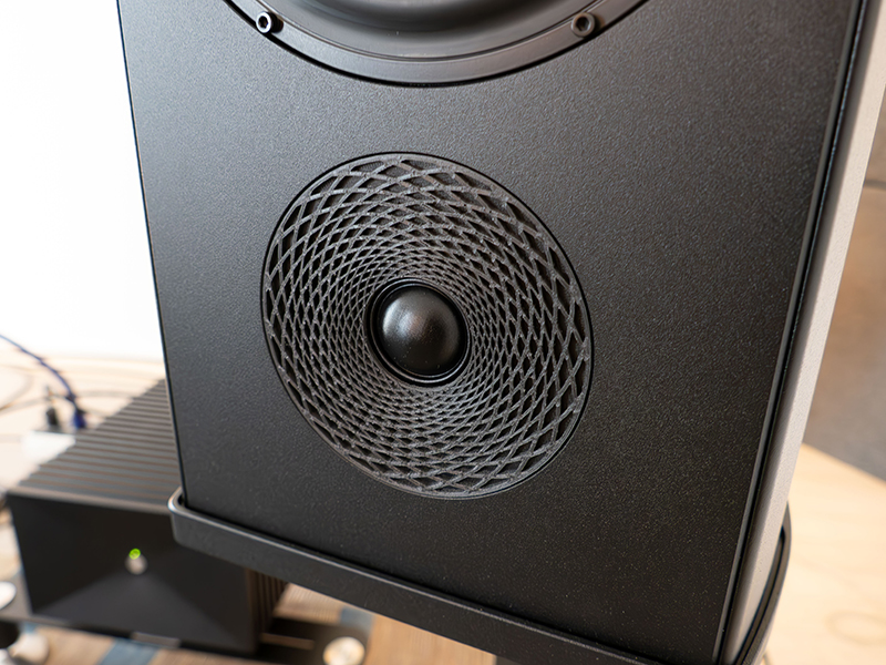 La struttura che si vede al centro della membrana non è un semplice cappuccio parapolvere, per quanto esteticamente raffinato possa essere, ma un elemento che viene stampato in base a parametri predefiniti. Il risultato è una disposizione ottimale di fibra di carbonio e nylon a struttura reticolare, presa in prestito dalla geometria naturale, che fornisce significativi miglioramenti a detta del produttore sia nella precisione della risposta in frequenza che nella riduzione della distorsione.