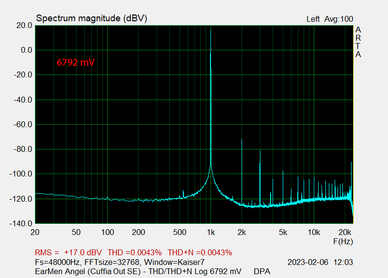 Ed eccoci giunti alla valutazione dell'uscita cuffia, effettuata in modalità sbilanciata. Sempre tre le tensioni test prescelte per la fondamentale a 1000 Hz: 1500 mV, 4000 mV e 6792 mV, si tratta di valori sostanziosi, grazie ai quali l'Angel non avrà problemi a pilotare anche cuffie difficili.