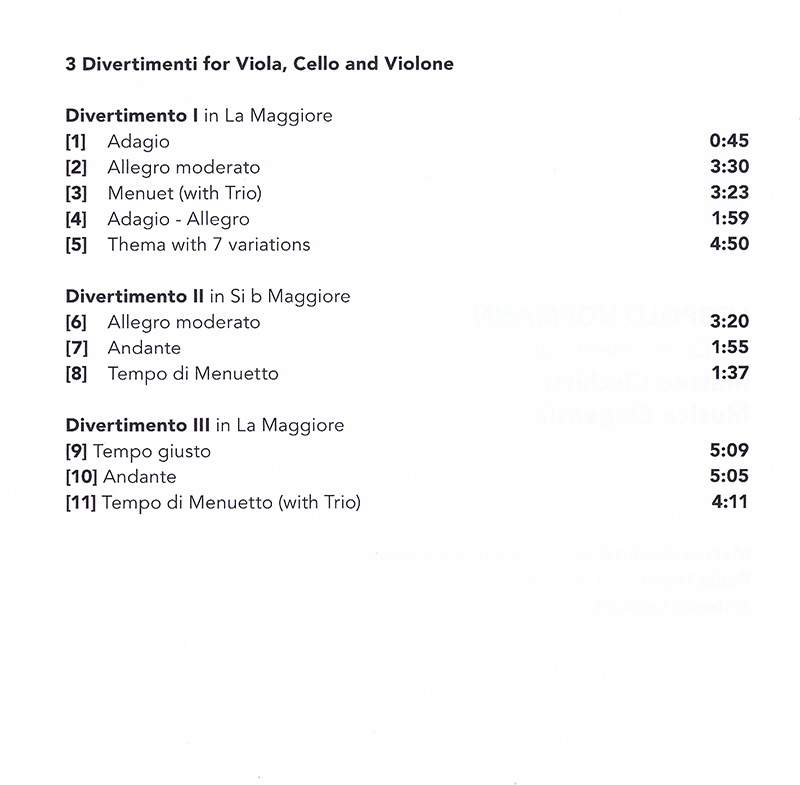 L'innocente candore di questa musica, ce ne rendiamo conto leggendo le note di copertina, reca con se l'indeterminatezza di contorni insita nel genere del divertimento, essendo questo un insieme di brani strumentali di libero assemblaggio, già dalla sua nascita gemello e talvolta indistinguibile da altri generi come la serenata, la cassazione, il capriccio, il notturno. Per di più incerto nella sua fisionomia, se pensiamo che sino all'intorno del 1780 si riferiva a tutte le composizioni strumentali non sinfoniche. Un'ambiguità che getta le sue ombre sulle stesse composizioni contenute in questo disco, considerabili nella loro forma come terzetti e pubblicate nel 1775 con l'appellativo di "Sonate" nell'edizione di Hummel, ma che figuravano come "Divertimenti" nelle ristampe che seguirono. In questi Sei Divertimenti Op. 1 scopriamo una considerevole varietà di accenti espressivi, situazioni strumentali e avvicendarsi di movimenti, compreso l'uso diversificato dell'Adagio, concepito come breve introduzione nel Divertimento I in la maggiore o come movimento a se stante, di respiro e strutturazione non fugaci, nel Divertimento VI. Troviamo inoltre una demarcazione strumentale tra i primi e i secondi tre, nei primi figurando il violino e nei secondi la viola (magnificamente suonata dalla brava Paola Nervi) mentre Cicchitti e Coloccia fanno coppia fissa in tutti. È nella natura delle cose che il timbro più scuro della viola condizioni il corpo del messaggio sonoro, conferendo una maggior sensualità al discorso musicale. Anche nel mero numero di tempi c'è una certa varietà: il N.1 ne conta cinque, quattro il numero 6, tre i numeri 2, 3, 4 e solo due movimenti ha il Divertimento 5.
