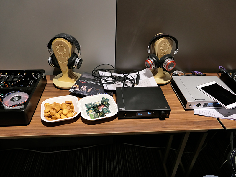 Ultimo banco, allestito con due cuffie Spirit Torino Mistral Bluetooth e una Mistral Pro, auricolari LE-M1 e Audio Player PAW S2 (dell'asiatica Lotoo) e tre elettroniche Audio-ga.