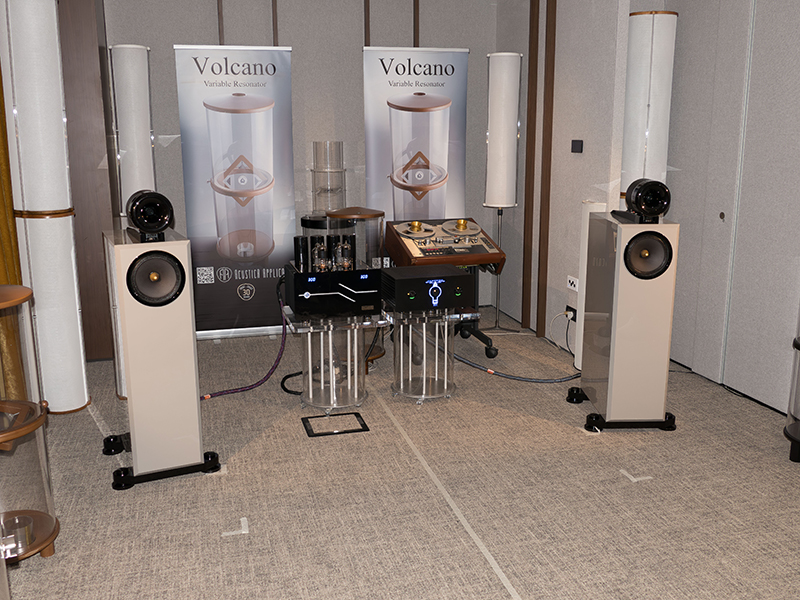In Sala Bosco Verticale 1 è stato dimostrato un impianto così composto: preamplificatore valvolare Ferrero L9, (una novità), amplificatore finale di potenza valvolare Alieno 150-120 LTD, diffusori Cessaro Opus II (altra novità). Strettamente analogiche le sorgenti, rappresentate dai registratori a bobina professionali Studer e Sony. Cavi AAL Acustica Applicata Aluminium Cables. Non poteva mancare un accurato trattamento acustico della sala, realizzato con elementi DaaD, Polifemo, Volcano, Halifax e i nuovi BAT, tutti di Acustica Applicata. Il BAT è un risonatore variabile da soffitto che può essere fissato con due tasselli e viti per soffitti in muro intonacato e con due viti da legno per soffitti in doghe o perline di legno. L'inclinazione della membrana trasparente produce variazioni tonali e nella velocità di risposta ai transienti, mentre la sua progressiva inclinazione dalla posizione di partenza parallela al soffitto offre una risposta con sempre maggior energia in gamma medio alta. Ad ogni modo, i migliori effetti sulla velocità e il rilascio dei transienti si ottengono con la membrana parallela al soffitto.