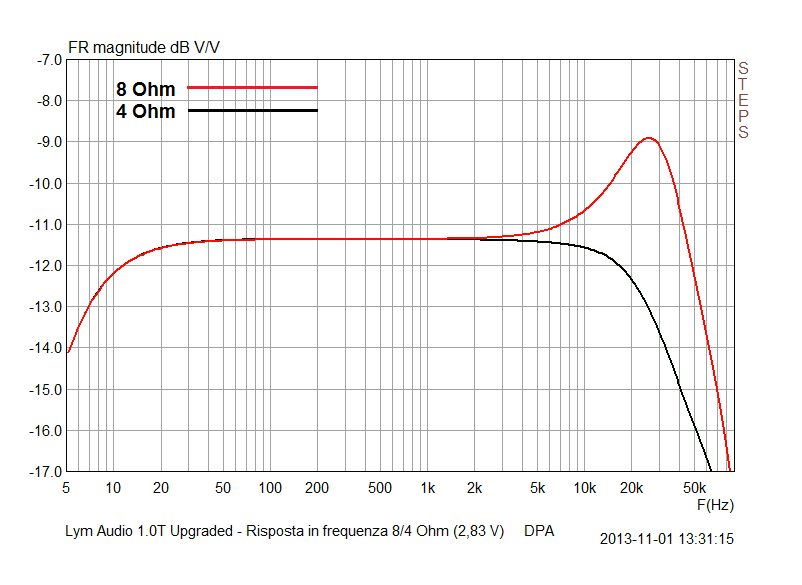 La risposta in frequenza rilevata sui due carichi "standard" di 8 e 4 Ohm rivela una caratteristica distintiva dei T-Amp e, più in generale, di molti amplificatori operanti in classe D. Parlo della ben nota sensibilità al carico che porta la gamma medio-alta a variare in modo più o meno evidente a seconda dell'impedenza di carico (diffusori). Su 8 Ohm la strada è in leggera salita già a partire da 3 kHz circa, un fenomeno che diventa più evidente superati i 10 kHz per raggiungere il picco massimo di esaltazione a 26000 Hz, già però fuori dalla banda audio, dove c'è una differenza di 2,455 dB rispetto ai 1000 Hz. Considerato il fatto che la massima frequenza udibile dall'uomo è circa 20000 Hz, il ragionamento va ridimensionato entro quel limite. Si tratta di un approccio più realistico che "sdrammatizza" i riscontri: lo scostamento dalla porzione lineare di emissione è di soli 0,69 dB a 10000 Hz, che salgono a 2,11 dB al limite dei 20 kHz. La situazione si capovolge se il carico diventa 4 Ohm. Qui apprezziamo un calo progressivo a partire dalla stessa frequenza (3 kHz), che porta i 10.000 Hz a -0,2 dB mentre i 20.000 Hz sono attenuati rispetto a 1000 Hz di quasi 1 dB, 0,968 per la precisione.