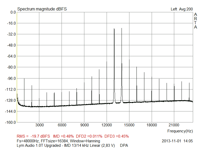 A 1 Watt di potenza leggiamo uno 0,036% di THD e 0,039% di THD+N, valori confortanti che ritroviamo praticamente immutati anche nelle misure condotte a tensioni più elevate. Meno favorevole la IMD con doppio tono di prova a 13 e 14 kHz, attestatasi sullo 0,48%, con un ampio contributo delle componenti di terzo ordine (DFD3 a 0,45%) rispetto a quelle di secondo (DFD2 0,011%). La conferma di un andamento meno favorevole sulle alte frequenze, riscontrato anche nelle misure di Distorsione vs Frequenza, viene dal doppio tono a 19/20 kHz dove si raggiungono valori più elevati: 0,94% con le componenti di terzo ordine ancora superiori a quelle di seconda (DFD3 allo 0,89% e DFD2 molto bassa, allo 0,0093%). Più fausti i risultati nella SMPTE IMD con doppio tono 250 e 8000 Hz, una misura dove il dislivello tra le due frequenze test è notevole. Il Lym si difende bene esibendo uno 0,22%, ancora con i componenti di secondo ordine più contenuti rispetto a quelli di terzo: MD2 0,072% contro MD3 0,20%.