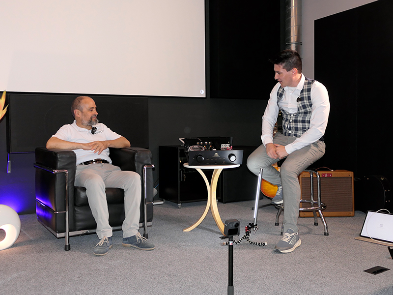È un sistema che rende la gestione dell'apparecchio molto più flessibile, oltre che una necessaria concessione alla modernità. Non possiamo far finta di vivere ancora negli anni '70. In futuro la linea M2Tech Classic si arricchirà di nuovi oggetti, questo avverrà il più presto possibile e compatibilmente con il lavoro di sviluppo "in itinere". La prossima tappa sarà un lettore di rete. In fase di sviluppo c'è anche un preamplificatore dalle prestazioni molto interessanti, da destinarsi sia ai finali di potenza che andranno a rimpolpare la serie Classic, ancora in studio, che all'utilizzo con diffusori attivi, ultimamente sempre più diffusi. Chiude il cerchio della conferenza l'intervento del distributore italiano DML Audio, nella persona di Massimo La Vigna, un professionista che si è appassionato alla riproduzione audio all'età di dodici anni, nel 1971, quando ebbe in regalo un giradischi e si costruì le prime casse acustiche. I suoi genitori erano disperati perché tirava cavi per tutta la casa, aveva messo altoparlanti un po' dappertutto. Al compimento dei quattordici anni questi gli promisero in regalo un impianto HiFi, a patto che lui rimuovesse tutto quello che aveva seminato per la casa. E così fu.