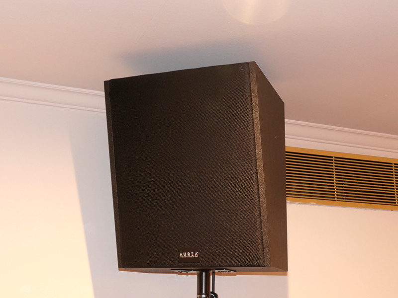 Nella sala della Audio Quality l'ingresso dei visitatori era organizzato in precise sessioni a orario, le quali venivano fatte rigorosamente rispettare. Alla mia richiesta di entrare per scattare delle foto, gli operatori mi hanno concesso il breve tempo intercorrente tra l'uno e l'altro turno. Un modo di fare certamente rispettoso per i partecipanti, che così non erano infastiditi del continuo via vai presente in altre sale. Inoltre, un volantino indicava il setup in dimostrazione: Videoproiettore Sony VPL-XW7000ES 4K Laser, Videoprocessore MadVR ENVY PRO 4K, Schermo Alto Contrasto Dark Star9 ISF, Nvidia Shield, Processore Audio Stormaudio ISP Elite MK3, Amplificazione Aurea Kino4 6K 4x720 Watt/Aurea Kino8 6K 8x340 Watt/Aurea Kino4 2K4 4x350 Watt. Un impianto semplicemente grandioso, configurato 9.4.4 Canali Dolby Atmos, dove il suono era emesso dai diffusori Aurea 17, Aurea IW 6+6, Aurea 27, Aurea 10 e Subwoofer JL Audio Fathom F113 V2.