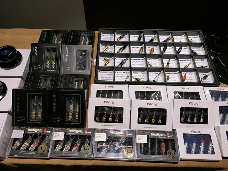 Dalla sinistra, connettori di potenza Viablue e WBT NextGen. Connettori vari Axiomedia: RCA, banana. Connettori a banana Viborg.