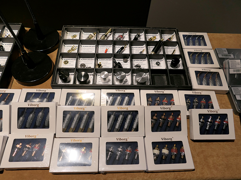 La ricca carrellata inizia con gli accessori. In questa foto vediamo (da sinistra) una placca portacontatti per diffusori, potenziometri della giapponese Alps, liquido di pulizia per dischi in vinile Dayton Audio con panno in microfibra, cinque stabilizzatori per giradischi in Alluminio con bolla Viborg Audio.
