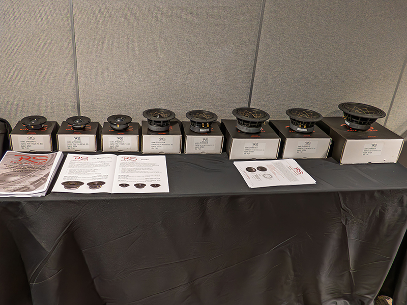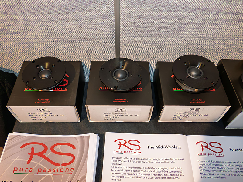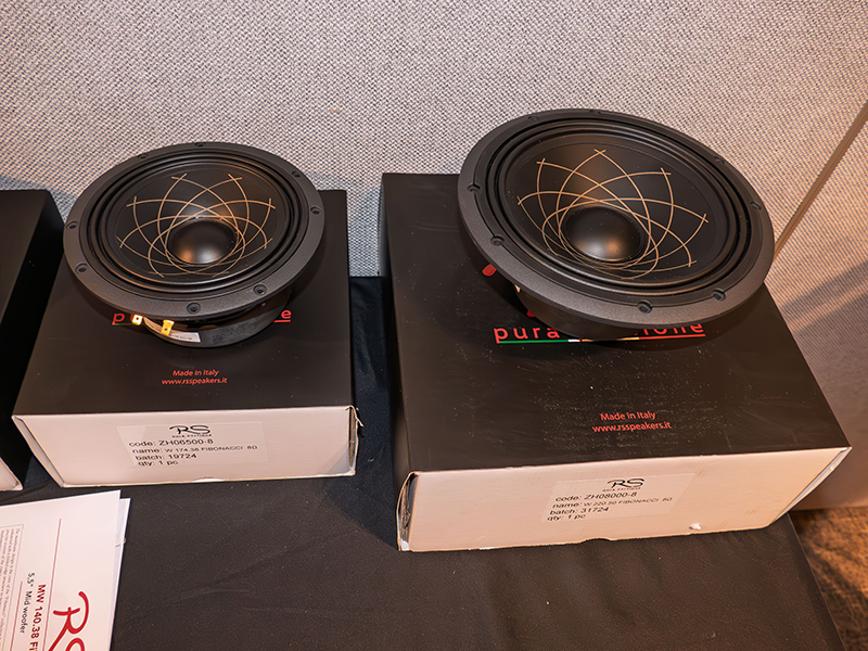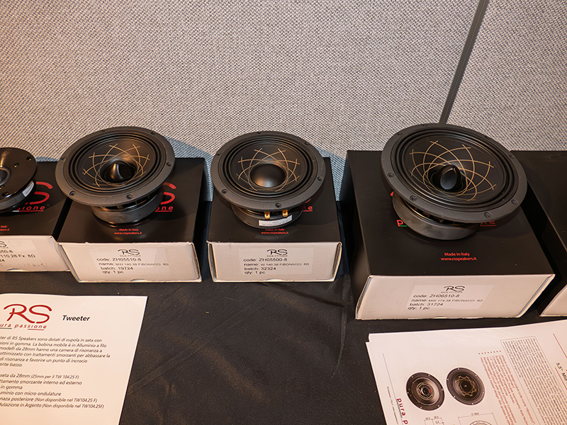 L'ampia carrellata d'immagini inizia con questi otto altoparlanti, prodotti da una ditta che ho conosciuto alla Quinta Rassegna Hi-Fi Audiocostruttori svoltasi a San Vincenzo (LI). Parliamo della RS, un'azienda che produce trasduttori fondata da Raimondo Sbarbati. Vanta particolari tecnologie, implementate nei diaframmi del woofer con un esclusivo processo brevettato di erosione della superficie laser e nelle cupole di seta dei tweeter, strutturalmente valorizzate con un doppio processo di smorzamento meccanico.
