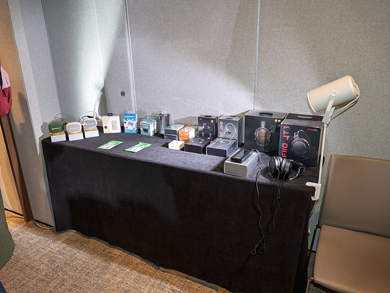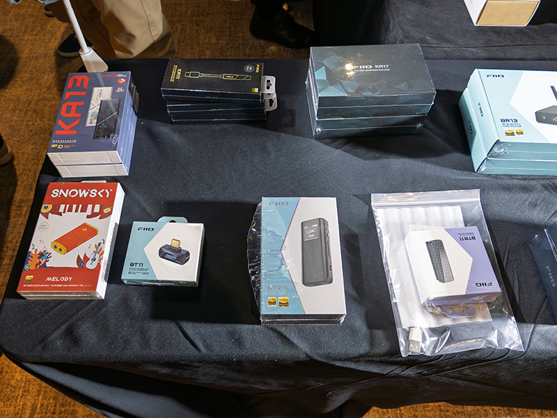 Si ritorna al marchio FiiO con questo tavolo, dove troviamo (in prima fila da destra) i DAC/amplificatori per cuffie Bluetooth BTR11 e BTR15, trasmettitore audio Bluetooth ad alta risoluzione BT11 e lo SnowSky Melody, un DAC/amplificatore USB portatile con finitura in legno noto per il suo design retrò. Implementa delle avanzate funzionalità di elaborazione digitale del suono (DSP) e utilizza due IC DAC Cirrus Logic CS43131. In seconda fila, da destra: ricevitore Bluetooth ad alta risoluzione BR13, DAC/amplificatore per cuffie portatile KA17, il già visto KA11 e il KA13, è un performante "dongle" DAC/amplificatore portatile.