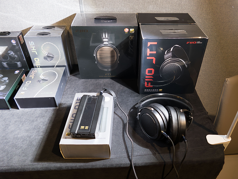 Da destra, una cuffia importante della FiiO, l'Over-Ear dinamica JT1, affiancata dalla FiiO FT1, un'altra Over-Ear dinamica però del tipo "Closed-Back". A fianco c'è un Fiio Q15, amplificatore per cuffie portatile dotato di Bluetooth e DAC DSD256 e i sofisticati auricolari FiiO JH5, con membrana in carbonio a 3 vie da 10 mm e cavo intercambiabile.