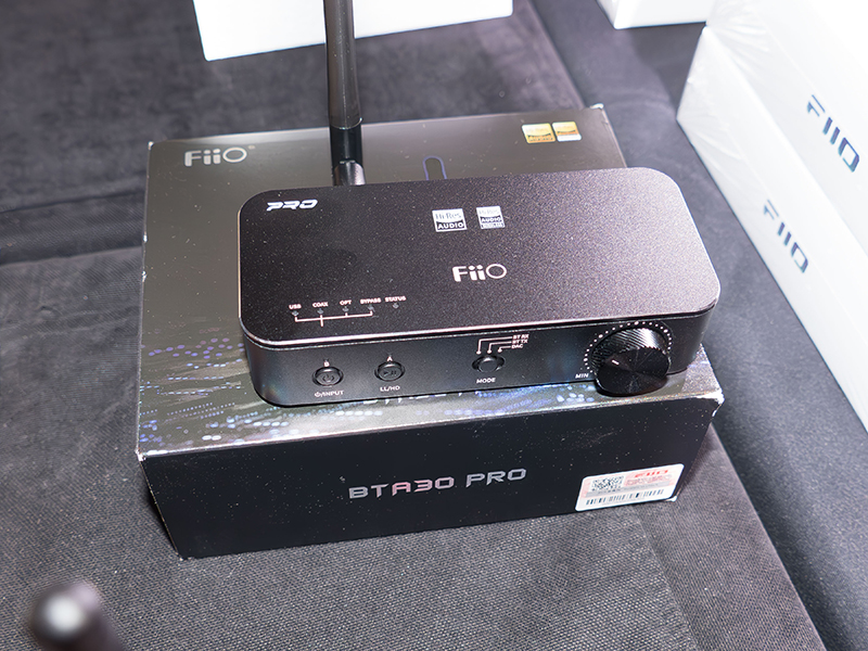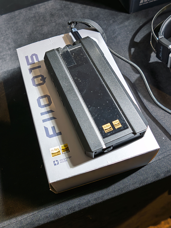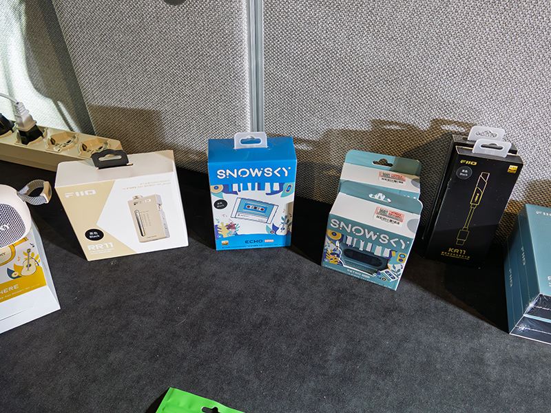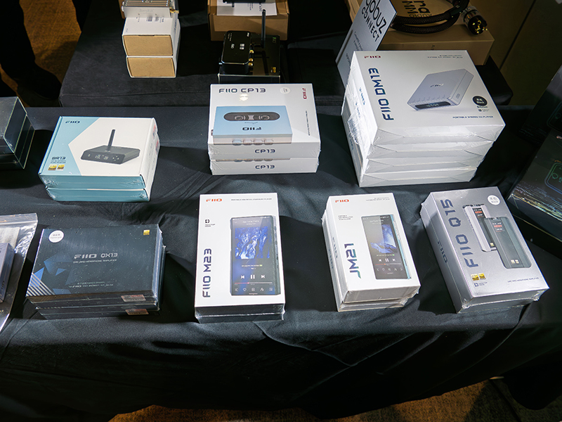 Ancora oggetti FiiO (ce ne sono davvero tanti in produzione!). In prima fila, da destra, il già visto Q15, i DAP (Digital Audio Player) ad alta risoluzione JM21 ed M23 e il QX13, versatile DAC/amplificatore per cuffia dotato di un doppio chip DAC ESS ES9027S PRO, con uscita sia bilanciata da 4,4 mm che standard da 3,5 mm. Interessante anche l'implementazione di un equalizzatore parametrico per adattare la resa sonora alle proprie preferenze o al tipo di cuffie utilizzate. Nella fila posteriore, da destra, ci sono il lettore CD portatile DM13 (si, se ne producono ancora...), il lettore di cassette stereo portatile CP13 (ancor più incredibile del lettore CD) e il ricevitore Bluetooth ad alta risoluzione con DAC integrato BR13.