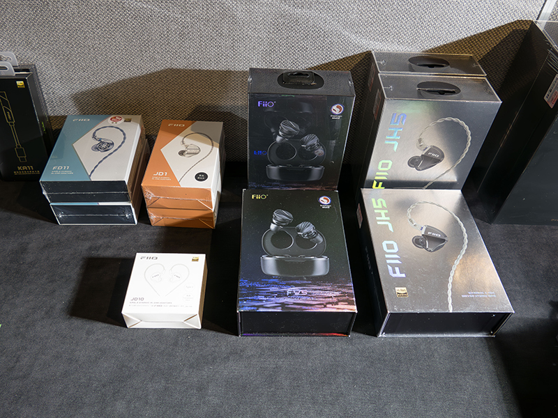 Ancora oggetti FiiO, un'azienda cinese fondata nel 2007 che nel tempo ha costantemente incrementato il suo catalogo prodotti sino a renderlo molto nutrito. Da destra, oltre ai già visti auricolari JH5, ci sono gli FW5, gli "In-Ear" JD10 (in primo piano), gli JD1 e FD11.