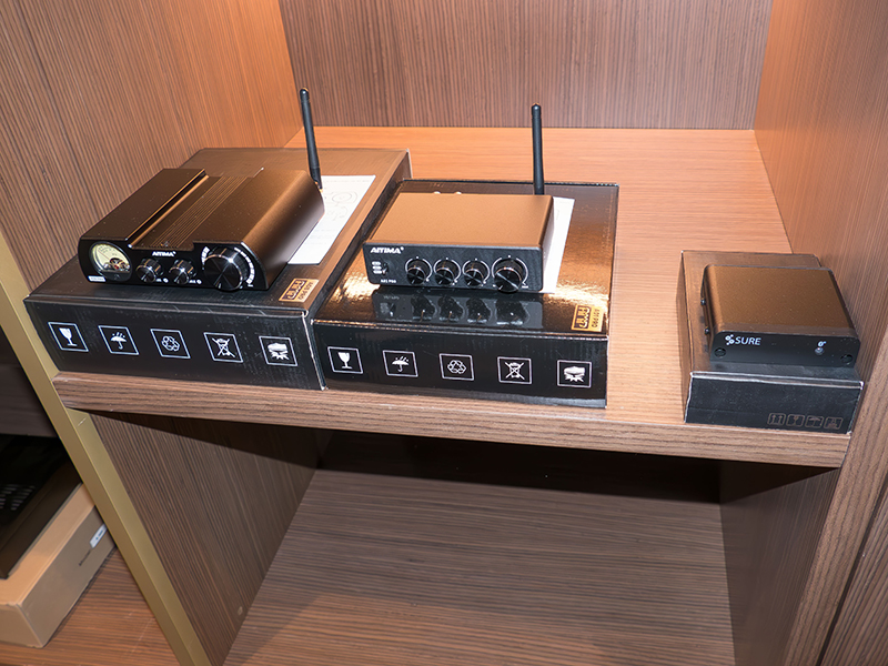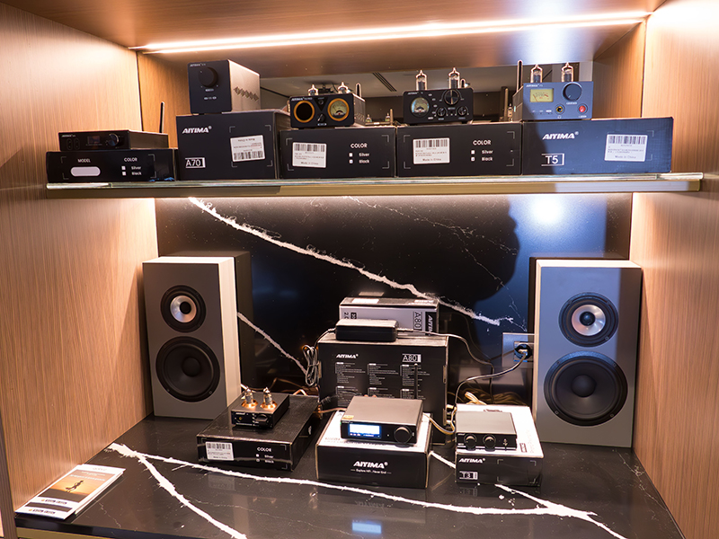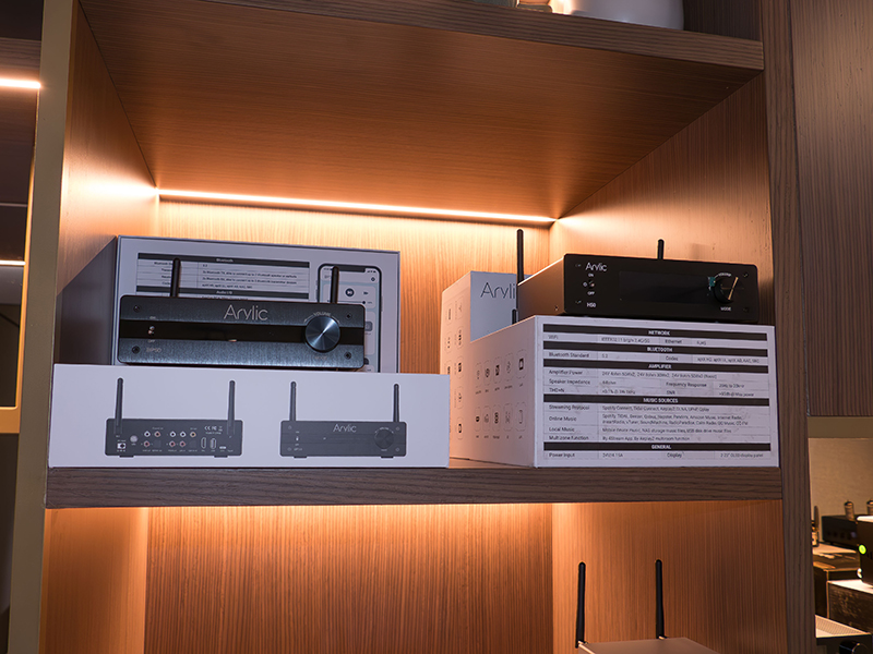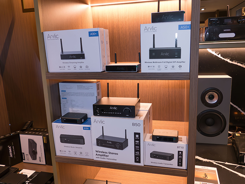 L'Arylic H50 (a destra) è un versatile amplificatore integrato stereo senza fili che supporta l'Airplay 2, Spotify Connect, Tidal Connect e funziona con Alexa. I suoi IC: DAC Sabre ESS9023P e Bluetooth Qualcomm QCC3040. Supporta il WiFi 2.4/5G e il Bluetooth 5.2 aptX HD. Al suo fianco era esposto il preamplificatore audio Bluetooth Arylic BP50, il quale si distingue per la sua ampia connettività e per la capacità di funzionare sia come ricevitore che come trasmettitore Bluetooth, supportando codec ad alta risoluzione come aptX HD e aptX Low Latency.