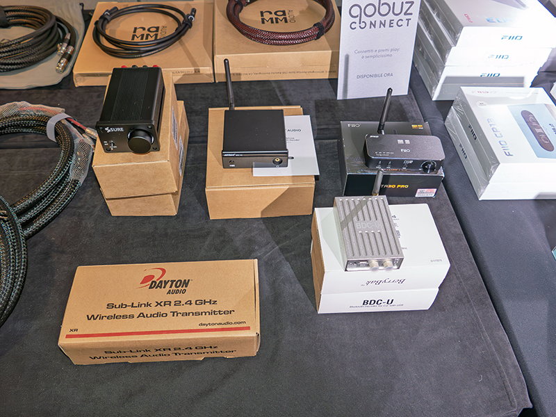 Tra gli ultimi oggetti fotografati ci sono (in primo piano da destra) il convertitore audio Bluetooth/USB BerryBak BDC-U, pensato per uso Car ma utilizzabile anche in ambito Home, e il Wireless Dayton Audio Sub-Link XR 2.4 GHz, un sistema di trasmissione e ricezione audio senza fili per subwoofer che permette di posizionarne uno attivo in qualsiasi punto della stanza senza dover far passare un cavo, presumibilmente lungo e ingombrante. In secondo piano, sempre da destra, vediamo il FiiO BTA30 PRO, ricevitore, trasmettitore e convertitore digitale-analogico (DAC) Bluetooth e l'Aiyima DAC-A1, un DAC versatile e compatto che funge anche da amplificatore per cuffie. In ultimo c'è un prodotto non recente, il compatto amplificatore integrato in Classe D Wondom AA-AS32157, basato sul mitico chip Tripath TA2024 e venduto anche sotto il marchio Sure Electronics.