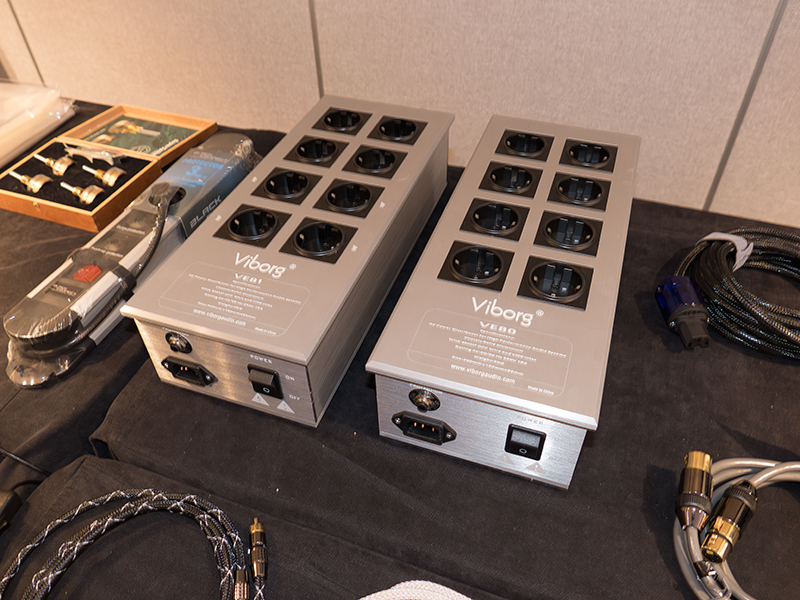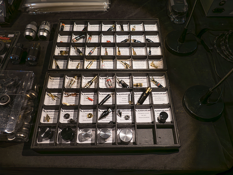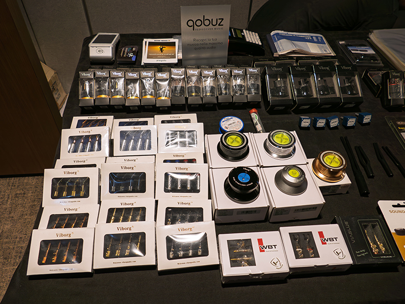 Prese di alimentazione, connettori vari per diffusori Viborg, morsetti stabilizzatori per giradischi con livella di precisione integrata, connettori per diffusori WBT e Viablue.