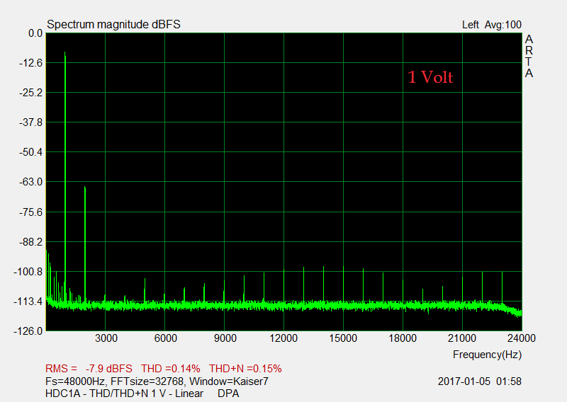 La misura della THD e THD+N è stata condotta su tre livelli di tensione, quelli che canonicamente adotto per i preamplificatori: 0,5 - 1 - 2 Volt. Le spettrali ottenute sono la dimostrazione perfetta della filosofia HDC, che privilegia la distorsione armonica di ordine pari. A 0,5 Volt si vede praticamente una sola componente a 2 kHz, generata da un segnale test sinusoidale a 1000 Hz. A questo livello di tensione la THD si attesta sullo 0,047%, allo 0,12% la THD+N. Si registra una certa presenza della spuria di alimentazione, individuabile alla frequenza di rete (50 Hz), questa appare a un livello di -92, a fronte di una fondamentale centrata a -18,37 dB. Di 96 dB l'intervallo dinamico, ottenuto dalla differenza tra il segnale utile e il tappeto di rumore. Raddoppiando la tensione del segnale test arriviamo a 1 Volt tondo tondo, secondo livello di misurazione. In questo caso la THD è dello 0,14%, quasi a pari con la THD+N, che si attesta allo 0,15%. Ancora consistente la presenza della seconda armonica in rapporto alla fondamentale, rispettivamente centrate a -64,9 dB e -8,13 dB. A 2 Volt troviamo invece una THD perfettamente appaiata alla THD+N, 0,32% per entrambe, mentre si fa vedere la terza armonica, non superiore tuttavia a -92,1 dB.