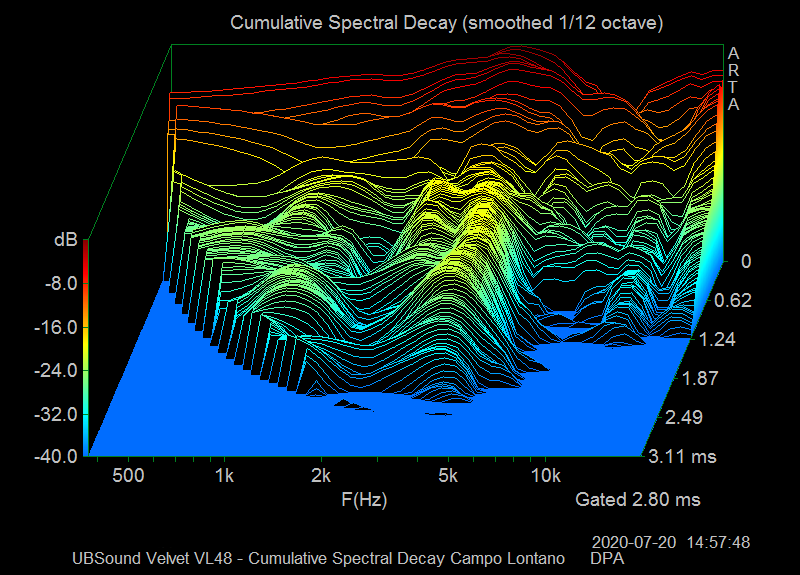 Il Cumulative Spectral Decay mostra un decadimento veloce dell'impulso iniziale, che si esaurisce in zona tweeter in appena 1,24 ms. Relativamente più lungo invece quello proveniente dal largabanda, com'è lecito aspettarsi, che invece decade di 40 dB in un tempo di circa 2,5 ms.