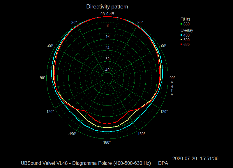I diagrammi polari a 360°, Waterfall 1/2 e Filled Contour completano il complesso quadro del comportamento emissivo delle Velvet VL48. Si tratta di uno scenario tipico e già visto tante altre volte, con le frequenze più basse che riescono ad aggirare le dimensioni fisiche del mobile per propagarsi posteriormente a esso. Di conseguenza i lobi polari appaiono a queste particolarmente ampi, mentre al salire della frequenza assistiamo a un progressivo restringimento del fascio emissivo, sino alle frequenze più alte. Nel nostro caso, tale graduale riduzione viene anticipata, apparendo sensibile sin dalle medie - medioalte, a causa delle dimensioni della membrana, che nel nostro largabanda ha un diametro effettivo di 17 cm (misurato da centro a centro della sospensione esterna). Infatti, un altoparlante conserva delle buone doti di dispersione sino a quelle frequenze la cui lunghezza d'onda è pari o superiore alla metà del suo diametro, se questa invece si riduce (come avviene sulle alte frequenze), si verifica una progressiva riduzione della dispersione angolare. Osservando il quinto grafico delle polari, si nota come nel passaggio da 6.300 Hz a 8.000 Hz, e ancor più da 8.000 Hz a 10.000 Hz, si ha un'inversione di tendenza, dovuta al contributo del tweeter, con un allargamento dei lobi. Anche la loro forma assume delle sembianze particolari (e qui entra in gioco la conformazione del diffrattore posto innanzi alla membrana del trasduttore). Si veda anche la polare a 20.000 Hz, con la sua foggia simile a un cuneo.