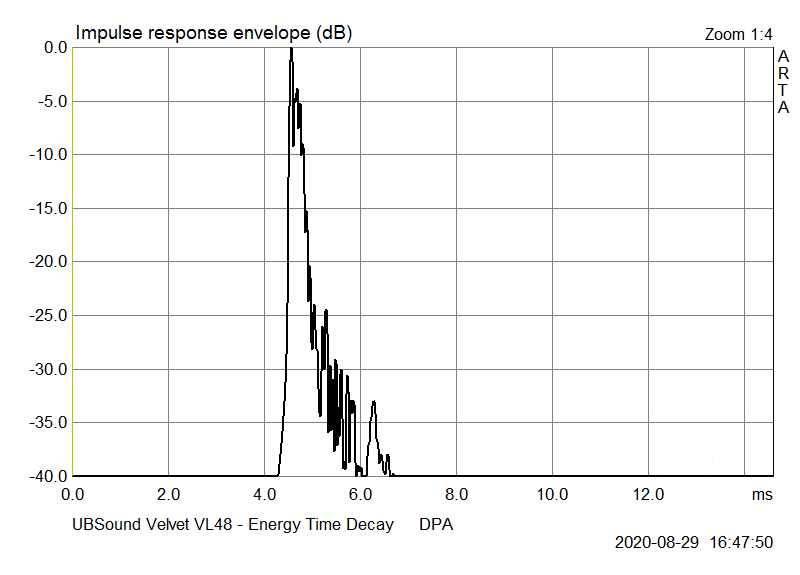 Decisamente valido lo smaltimento dell'energia sonora nel tempo, dovuto anche alla risicata larghezza del baffle frontale, che è largo 26 cm. Il decadimento raggiunge i -40 dB dall'impulso iniziale in 1,328 ms ed è anche molto regolare nel suo andamento, non rivelando particolari perturbazioni. Osservando il grafico, notiamo tre diversi impulsi, l'iniziale è da addebitare al tweeter, cui segue quello del largabanda e per ultimo troviamo quello generato dalle riflessioni sul cabinet. Infine un quarto impulso è dato dalla prima riflessione del pavimento.