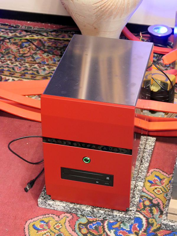 Prima di raccontare le mie impressioni d'ascolto è interessante fornire qualche cenno tecnico sull'impianto, interamente Esoteric Pro Audio, a cominciare dal Lettore di file e streamer di rete Multiplayer Volta, un computer che lavora su Sistema Operativo Windows ottimizzato per utilizzo audio. Ha il telaio sospeso in aria su campi magnetici, due le alimentazioni, una switching e l'altra ultralineare, determinanti come sappiamo per la qualità del suono. Molta attenzione è stata prestata alla scelta di tutte le parti, a iniziare dalla scheda madre, processore, memorie RAM e di archiviazione, che sono NVMe (Non-Volatile Memory express). Il Volta è configurabile a richiesta sia nella quantità di spazio di archiviazione che nelle uscite, tramite schede PCIe. Presente all'interno una sofisticata scheda audio Lynx AES16e con uscite AES/EBU. Vero cuore e centrale di gestione dei diffusori Kora è l'Audio Manager Fibonacci, apparecchio dedicato alla gestione dei processi audio per la multiamplificazione attiva. Le sue schede hanno le piste dorate su tutti gli strati, i DAC sono in grado di un campionamento pari a 32 bit/768 kHz, dispone d'ingressi bilanciati analogici e digitali (AES/EBU). Fiore all'occhiello l'alimentazione ultralineare con trasformatori dedicati per ogni tensione.
