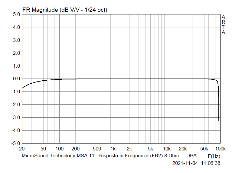 Molto regolare ed estesa si presenta la risposta in frequenza, rilevata secondo la tecnica del "Dual Channel", per una perfetta linearità del segnale test. Sul lato basse frequenze assistiamo a un calo davvero modesto, con i 20 Hz a -0,11 dB e i 10 Hz a -0,44 dB rispetto al centro banda (1000 Hz), assolutamente ininfluente sul suono. Sul versante opposto, troviamo i 20 kHz a -0,01 dB, i 50 kHz a -0,09 dB, mentre il punto a -3 dB si raggiunge ben oltre le possibilità di estensione dell'analizzatore (96 kHz). Proprio a quella frequenza il sottoslivellamento rispetto ai 1000 Hz è di soli 0,74 dB, a fronte di una banda passante dichiarata di 3 Hz - 260 kHz entro -3dB.