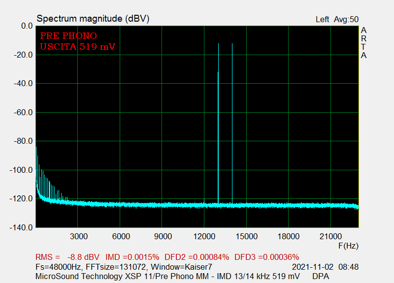 Qui entra in gioco l'Anti-RIAA hardware Motronix Rev-3B. I livelli di tensione in ingresso sono anche in questo caso tre, individuati per coprire la stragrande maggioranza delle eventualità d'uscita di una testina MM, cioè 1,5 mV, 3 mV e 5 mV. Non possiamo non apprezzare l'ottimo comportamento della sezione Phono, con valori di distorsione molto bassi in assoluto, per forza di cose lievemente superiori a quelli dello stadio linea. Il guadagno in tensione ottenuto in uscita è quello relativo al solo pre Phono, privo quindi del "rinforzo" dato dall'amplificazione aggiuntiva linea dell'XSP 11. Al livello di tensione più basso, di 155 mV, si parte con un ottimo 0,0022% di THD e 0,086% di THD+N, fanno seguito delle IMD congrue con questo valore, solo leggermente più alta la SMPTE IMD con doppio tono 250 Hz-8000 Hz, che arriva allo 0,012%, con una sostanziale parità tra armoniche pari e dispari (MD2 e MD3). Somministrando in ingresso una tensione di 3 mV otteniamo 309 mV in uscita, in questo caso le distorsioni sono ancora più favorevoli: 0,0011% di THD, mentre dello 0,0016%, 0,0019% e 0,0066% sono i tassi relativi alle tre IMD (13/14 kHz - 19/20 kHz - 250 Hz/8000 Hz). In discesa, come si può vedere dai grafici, i valori sull'uscita più alta di 519 mV, dove la THD è appena dello 0,00079%.