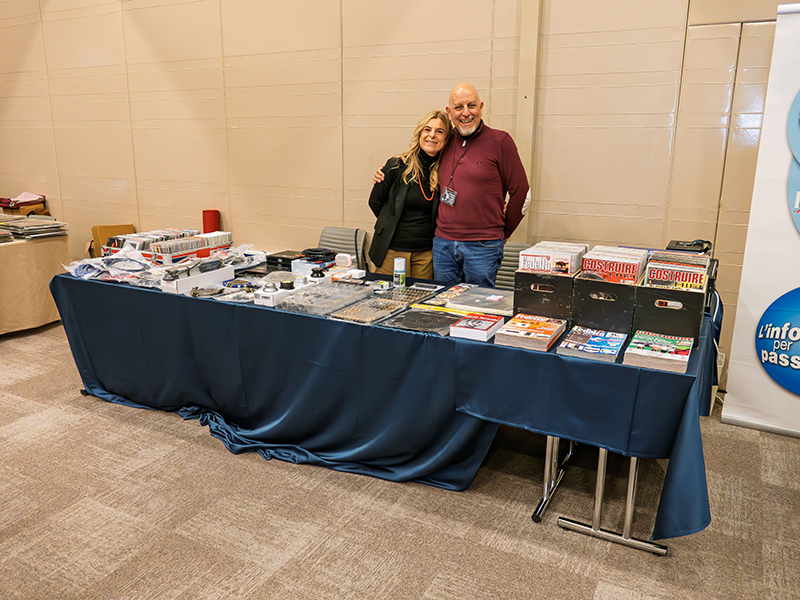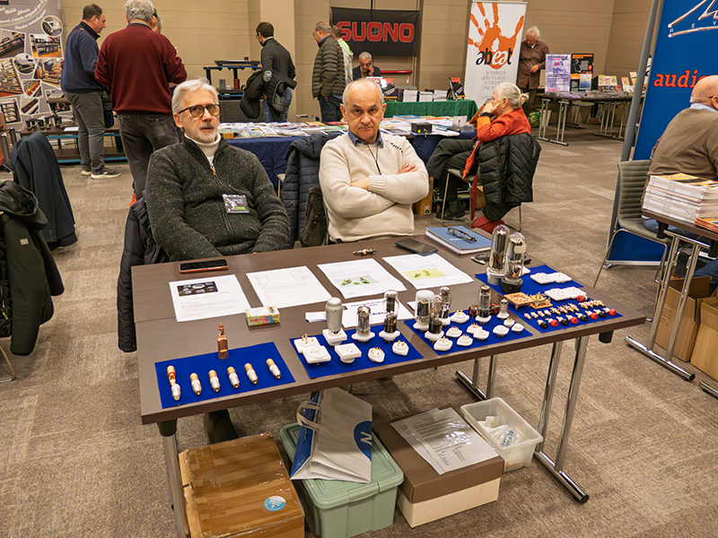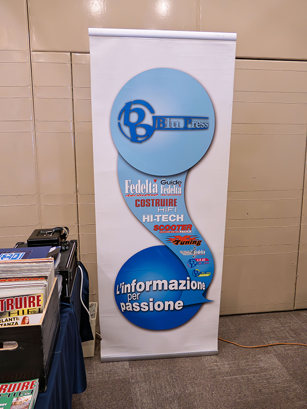 Nello spazio espositivo della Blu Press c'è sempre posto per cablaggi, accessori e una nutrita rappresentanza delle riviste Fedeltà del Suono e Costruire HiFI. Al banco vediamo Andrea e Cinzia.