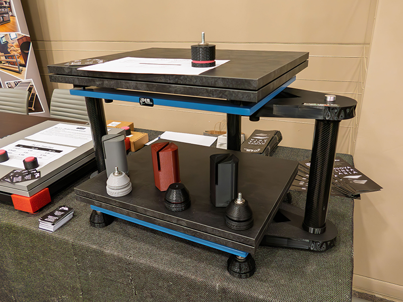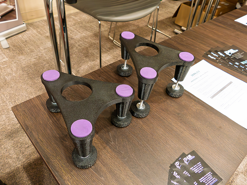 Una coppia di Hertz Pad 10, base universale progettata con tecnologia 3D e studiata per eliminare efficacemente le vibrazioni fino a 10 Hz. Il modello V1, che comprende solo la piastra con tre elastomeri viola, è indicato per l'uso diretto sotto i diffusori da scaffale, ma può essere utilizzato anche per isolare altri componenti sensibili alle vibrazioni. Il V2 invece include dei piedini regolabili di altezza variabile fino a 35 mm. Si prevede anche il modello V3, ancora in fase di sviluppo, da utilizzare direttamente sotto le elettroniche, giradischi, DAC, con possibilità di regolazione per consentire l'allineamento in bolla.