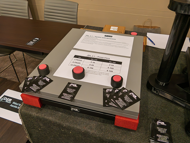 Rivedo sempre con grande piacere il gioviale Marco De Risi, fondatore nel 2013 dell'azienda DEMAudio, specializzata nella produzione artigianale di mobili porta elettroniche, librerie su misura e accessori audio per impianti Hi-Fi. Un professionista che ha abilmente unito artigianato italiano, ingegneria meccanica e ricerca acustica, elementi importanti per migliorare la qualità d'ascolto degli impianti. Il suo catalogo include diverse linee di prodotti, tra cui mobili e rack Hi-Fi, librerie, accessori antivibrazione e i sistemi S.B.A.M. (Sistemi Base Antivibrazione Modulari).