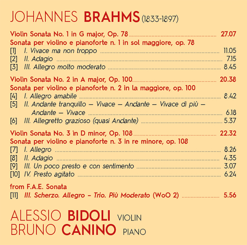 Non cerca l'autore in quest'opera drammatiche escursioni dinamiche, ma un andamento piuttosto soffuso, teso a ricreare un climax espressivo che concilia il dialogo tra i due strumenti, piuttosto che metterli in contrasto. Bidoli e Canino affrontano questa partitura con intelligenza e sensibilità, riconoscono e valorizzano le ragioni del cuore come quelle dell'intelletto senza far mai prevalere una o l'altra, in una commovente armonia d'intenti. Ligi a quello spirito di collaborazione che conduce a un dialogo costruttivo, mai eristico tra i due strumenti, che in ogni occasione si embricano con la massima naturalezza e al riparo da indebiti protagonismi. La Sonata N. 3 Op. 108 fu composta tra il 1886 ed il 1888, dedicata al direttore d'orchestra e amico Hans von Bülow. Venne eseguita per la prima volta al Teatro dell'Opera di Budapest da Jenő Hubay al violino e Brahms stesso al pianoforte, il 21 dicembre 1888. Una prima caratteristica che la distingue dalle precedenti due sta nel fatto di essere costituita non da tre ma da quattro movimenti: Allegro, Adagio, Un poco presto e con sentimento e un Presto agitato finale. Questa Terza Sonata si affaccia da subito più tesa e corposa della precedente, che in alcuni momenti rasenta l'evanescenza, dove il pianoforte è coinvolto in un maggior virtuosismo, nell'economia di un affascinante lavoro compiuto in direzione, ancora una volta, della variazione e scambio del ricco materiale tematico.
