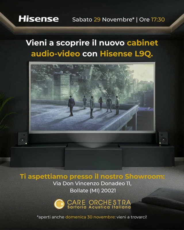 L'ho sempre detto e lo ripeto anche in quest'occasione, per quanto l'utilissimo strumento del Web sia sempre più invasivo nelle nostre vite, mai e poi mai potrà soppiantare il rapporto diretto con la realtà e con le persone che in essa si muovono. Può essere invece importante messaggero di un evento come quello che ho vissuto in prima persona la sera del 29 novembre U.S. presso il negozio bollatese Care Orchestra - Sartoria Acustica Italiana. Dei curatissimi spazi che ho conosciuto esattamente un anno fa, nel novembre 2024, in occasione della presentazione del diffusore Blaze Monitor di Brianza Audio Lab. Un cerchio che si chiude? Spero di no perché se dovesse essere organizzato un altro evento come questo, ritornerò certamente con piacere a vederlo. Si potrebbe coloritamente definire una manifestazione col botto, consumatasi alle porte dell'anno nuovo, che racchiude tre distinti capitoli: il sintetico racconto della storia della Care Orchestra, l'annuncio della nuova veste dei sistemi Brianza Audio Lab e la presentazione del nuovo videoproiettore Hisense L9Q. Un evento quindi tripartito, se vogliamo precursore di un nuovo modo di presentare la complessità insita nella moderna sostanza multimediale.