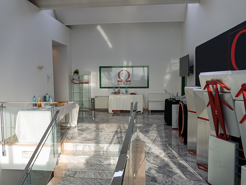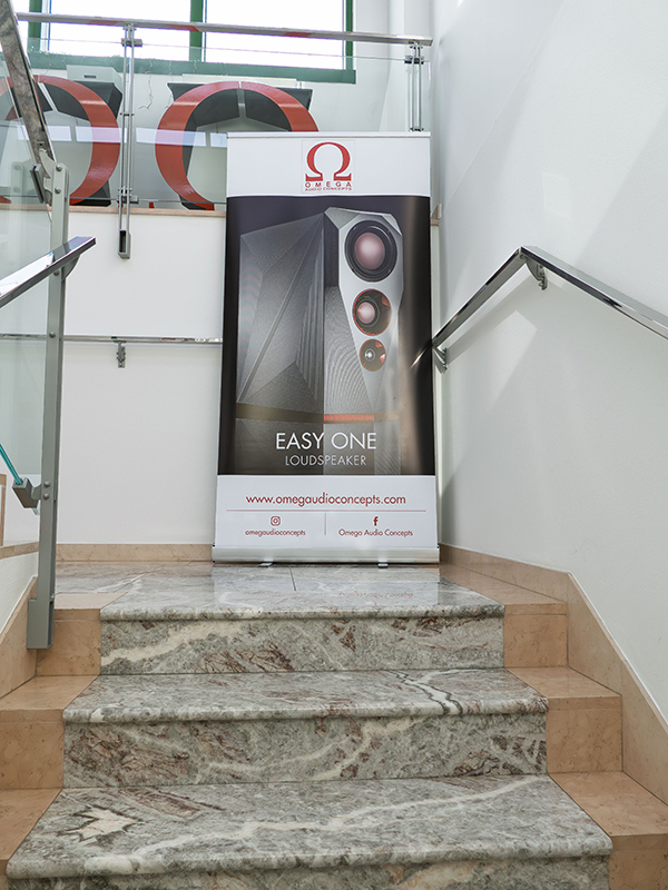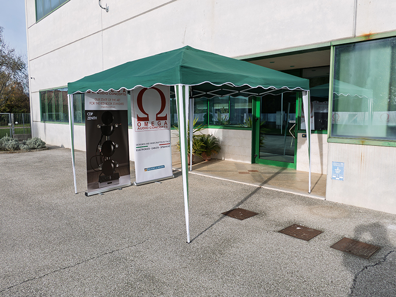 L'aspetto da capannone industriale del grande edificio che mi sono trovato davanti appena arrivato, con in cima sulla facciata la grande scritta "Officina Meccanica Zenit", rivela una parte della realtà che si muove intorno alla Omega Audio Concepts, quella appunto industriale, inerente alla complessa e raffinata lavorazione dell'alluminio con macchine CNC. Una volta raggiunto il primo piano si conquista tuttavia una dimensione affatto diversa, fatta di eleganza e musica riprodotta in modo eccezionale. Mi ha fatto da cicerone Gianpiero Peron, responsabile commerciale di Omega Audio Concepts e titolare della Zenit, l'azienda che si occupa delle lavorazioni meccaniche dei prodotti. Nella parte superiore dell'edificio si trova il quartier generale dell'azienda. Salendo due rampe di scale si raggiunge l'atrio Tiziano, qui stazionavano diversi oggetti in esposizione statica, per la gioia degli occhi due coppie di diffusori, Easy One e Micro XL, poi il distributore di rete Estremo, l'amplificatore AMP DNA, il sistema All-in-One Essenziale. Vicino alla finestra si potevano ammirare tre robusti e ponderosi telai nudi in alluminio. Tramite un corridoio laterale si accedeva infine alle sale (Palladio, Cima e Canova) dedicate all'ascolto di tre diversi impianti.