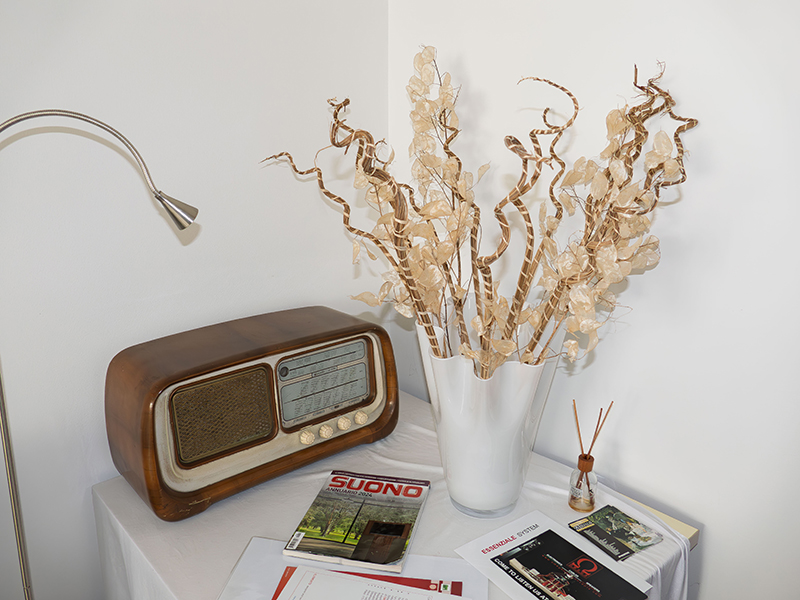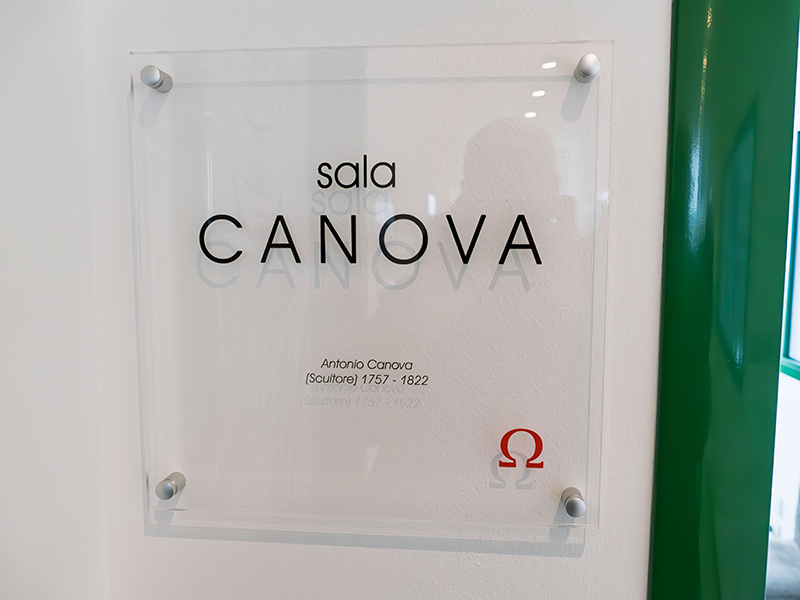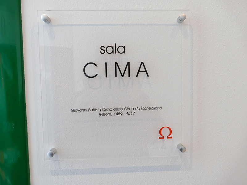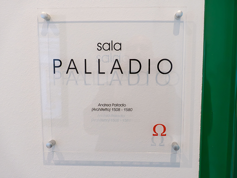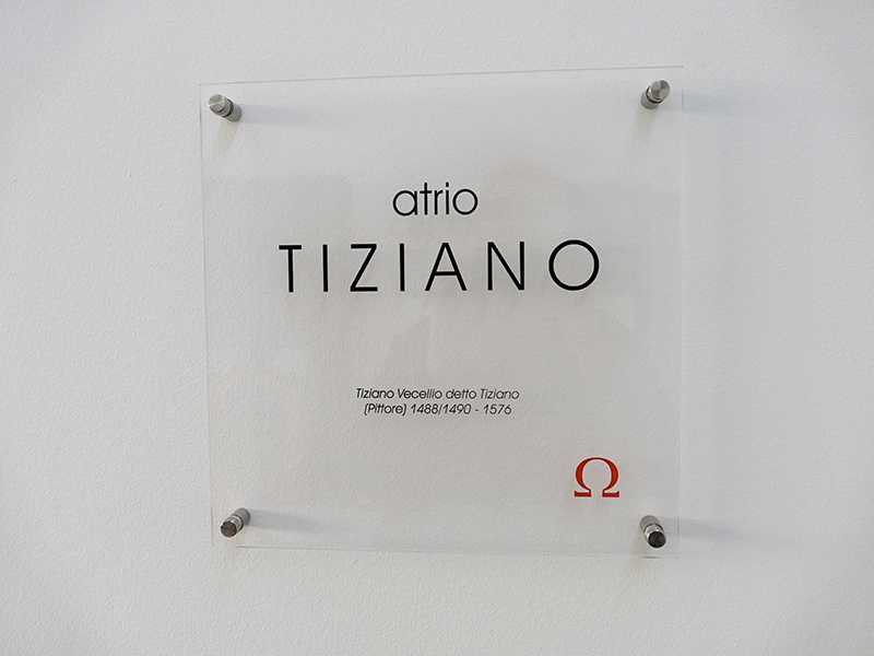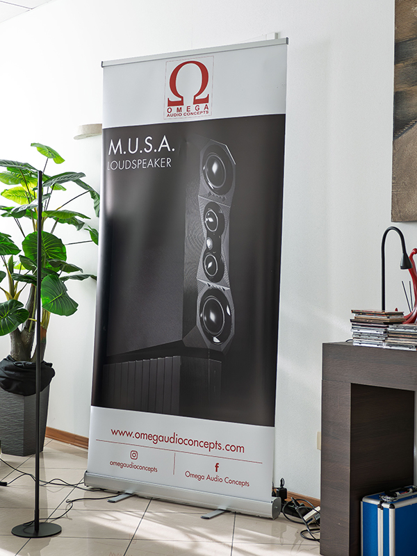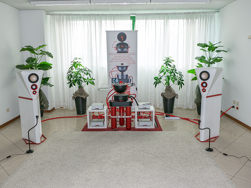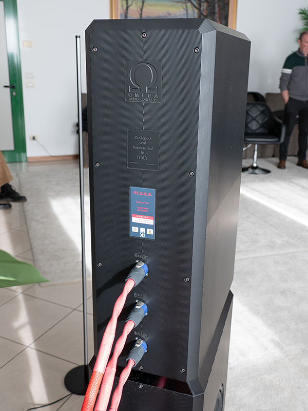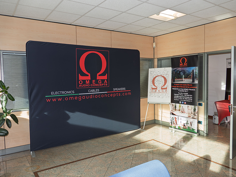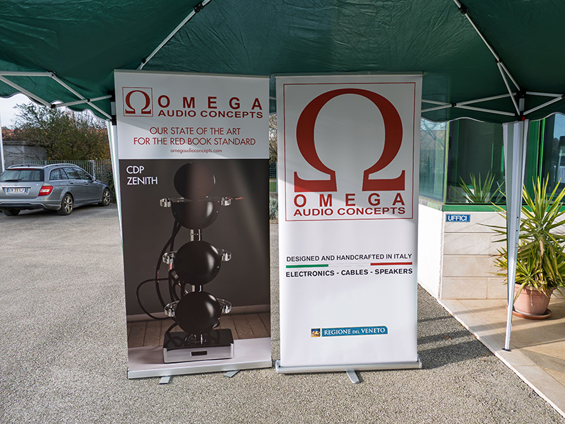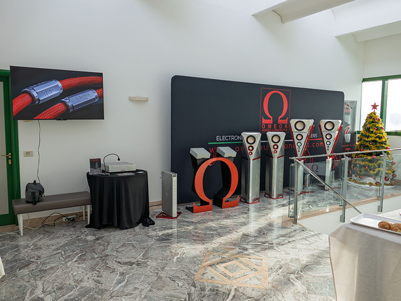 Sempre nell'Atrio Tiziano erano stati allestiti due tavoli con bevande e dolci, offerti ai visitatori dell'evento, mentre uno schermo mostrava i diffusori del marchio e alcune elettroniche in fase di lavorazione. Nei giorni 29 e 30 novembre U.S. come di consueto è stato organizzato un "Open Day", il proposito che si cela dietro quest'interessante manifestazione è quello di far conoscere il marchio a più persone possibili. La Omega Audio Concepts si è resa suo malgrado conto di non essere molto conosciuta, anche nel territorio circostante, e questa manifestazione ha proprio lo scopo di allargarne la conoscenza, nella consapevolezza che si tratta di un settore di nicchia, quindi poco noto. Una nicchia nella nicchia direi, visto l'impegno di spazio ed economico, nonché di peso, che bisogna sostenere per impossessarsi di queste meraviglie audio. Se assenza di compromesso dev'essere, al fine di raggiungere degli altissimi risultati sonori, assenza di compromesso sia, su questo non dev'esserci alcuna perplessità. È bene dunque che un numero sempre maggiore di appassionati si renda conto di quanto possa essere fedele la riproduzione audio a certi livelli. Durante la nostra conversazione Gianpiero Peron mi spiega la scaturigine dei nomi dati ai vari ambienti, che si è desiderato mutuare da grandi artisti che hanno onorato il territorio in cui ci troviamo, nomi che hanno a che fare con le arti figurative.