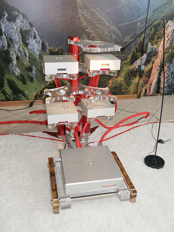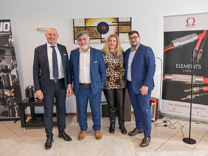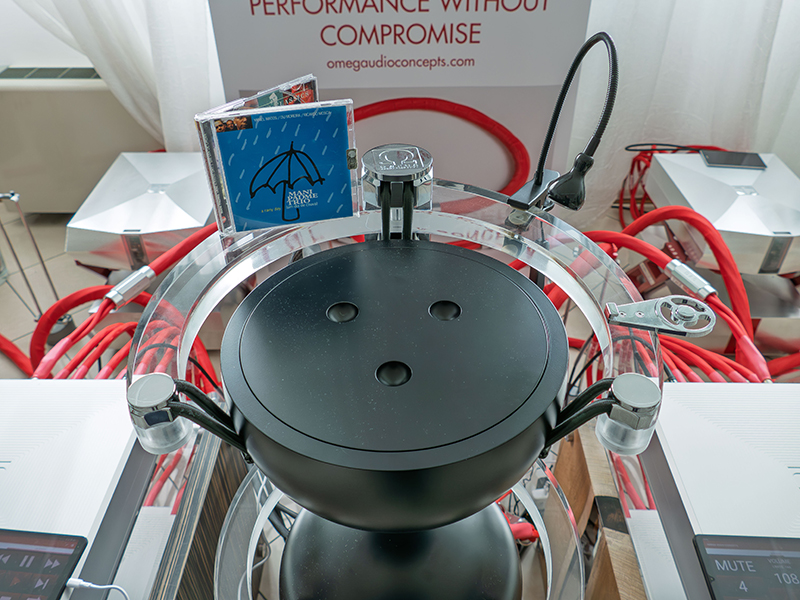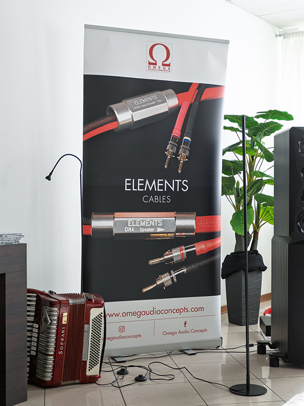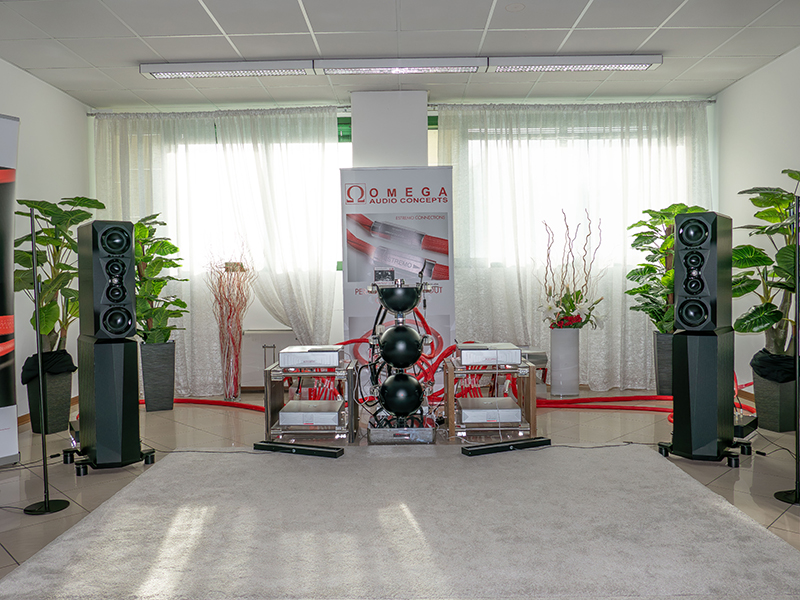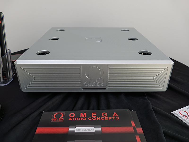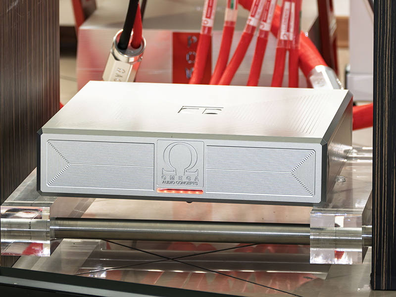 In questa due giorni sono state introdotte delle variazioni rispetto alle precedenti edizioni, l'esposizione e dimostrazione ha riguardato sorgenti tutte digitali, nella fattispecie lettori CD, tuttavia, mentre negli anni scorsi in sala Cima suonava una catena interamente composta dalla gamma DNA, nella presente si è invece attinto a componenti di serie diverse, sapendo già in partenza che sarebbero comunque andati benissimo insieme. Peron orgogliosamente sottolinea che Omega Audio Concepts è una delle poche aziende al mondo in grado di allestire un impianto con prodotti esclusivamente suoi. Componenti ad ogni modo inseribili singolarmente e senza problemi in contesti variegati, anche perché difficilmente il cliente si approccia al marchio veneto per allestire un impianto totalmente monomarca, ma inizia per passi approdandovi magari in un secondo momento. Si è verificata anche una certa promiscuità nei cablaggi, variamente prelevati dalle diverse gamme. La serie Element era il riferimento sino all'anno scorso, mentre in questo a Monaco è stata presentata la Estremo, che raggiunge un livello ancora superiore, tale da porla in cima alla produzione dei cablaggi. Ha esordito alla grande e sta dando al marchio delle belle soddisfazioni in termini di riscontro commerciale.