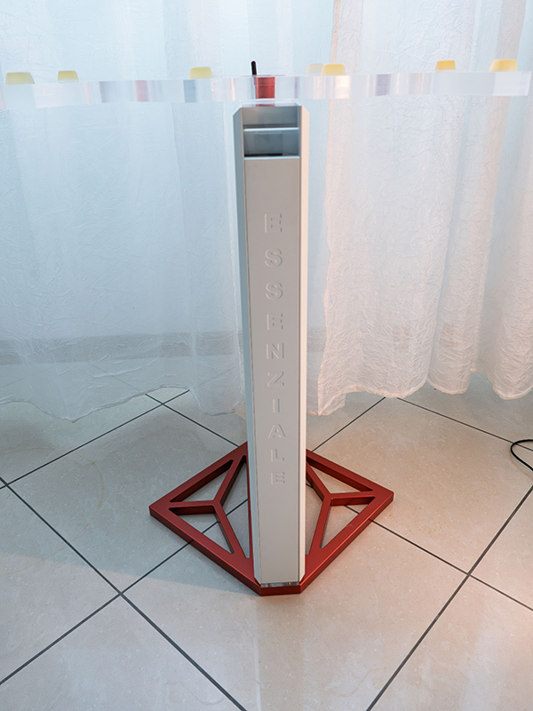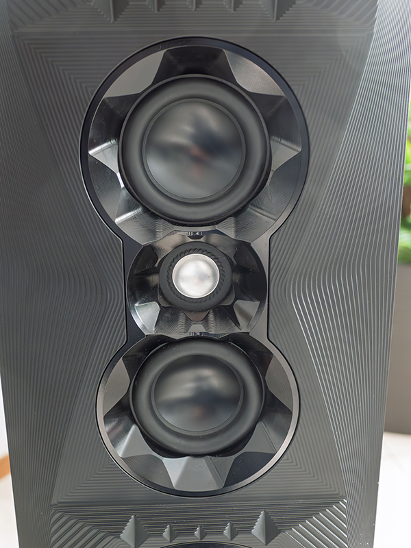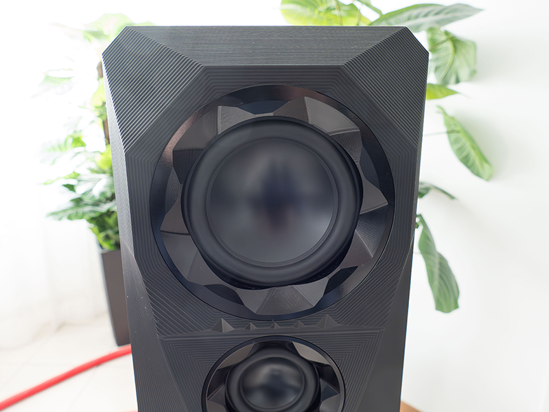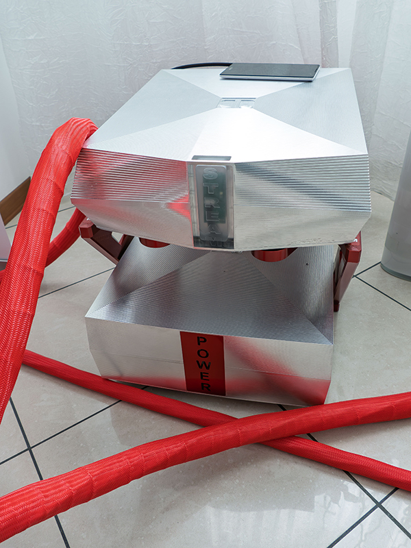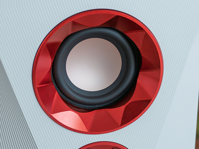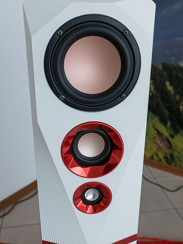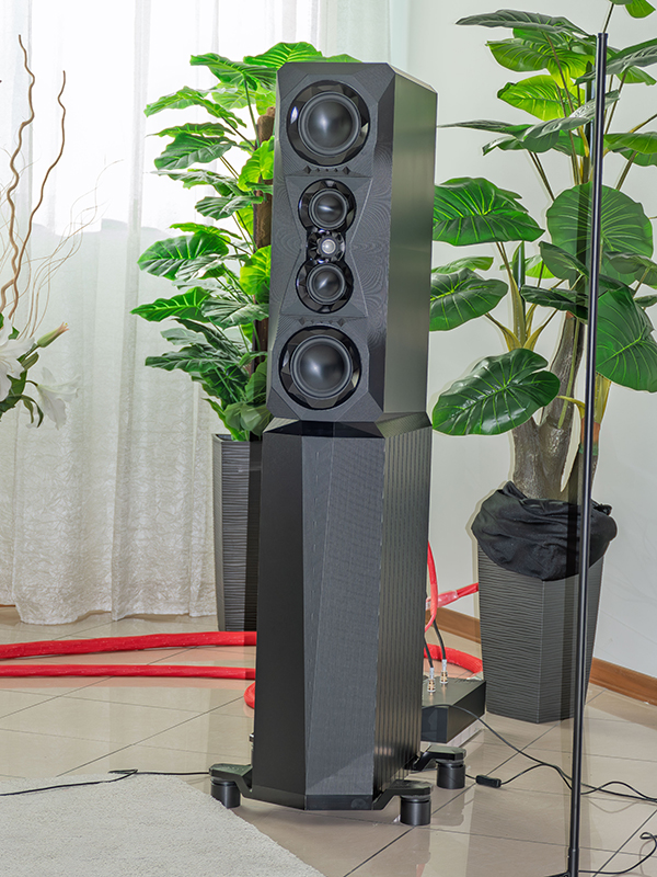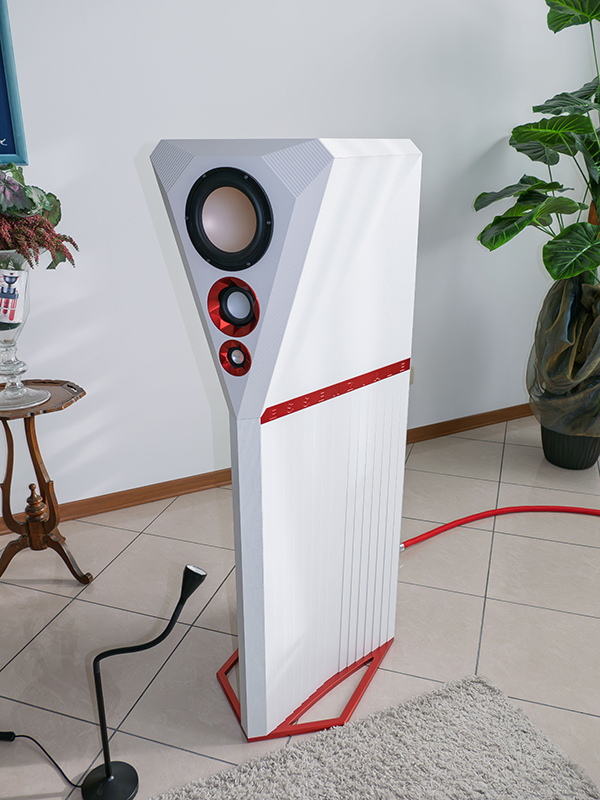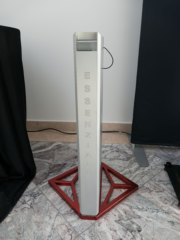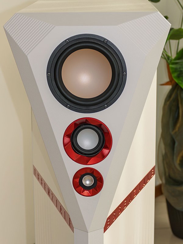 In questo colosso l'alimentazione di un singolo canale pesa ben cento chili. È scisso in quattro telai in alluminio scavati dal pieno con macchine CNC e sorretti da una struttura disaccoppiante/autoportante. Nati con questi sani principi fisici non possono non brillare di luce propria anche le elettroacustiche, declinate nei quattro modelli di Easy One, Essenziale. M.U.S.A. e Micro XL. L'Easy One è pensato per la sonorizzazione di ambienti medio-piccoli, anch'esso costruito interamente in alluminio ricavato dal pieno, come tutti i suoi fratelli, con pannelli che variano dai 40 ai 20 mm di spessore. Fedeli alla filosofia del marchio, hanno una struttura molto rigida cosicché il cabinet assorba meno energia possibile e non influisca con eventuali risonanze proprie al mascheramento del segnale. Nell'Essenziale i blocchi di alluminio ricavati dal pieno hanno spessori che vanno dai 100 mm del triangolo frontale ai 20 mm. Non affatto casuale o puramente esornativa è la struttura creata dai due triangoli intersecati tra loro: oltre alla rimarchevole rigidezza e l'assenza di pareti parallele, la forma a "Y" del frontale permette di ridurre al minimo il carico acustico degli altoparlanti frontali. Bisogna riconoscere all'azienda di Colle Umberto la genialità messa nell'ideare delle forme che siano insieme eleganti e fisicamente funzionali a far lavorare al meglio i trasduttori.