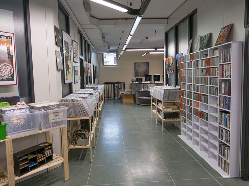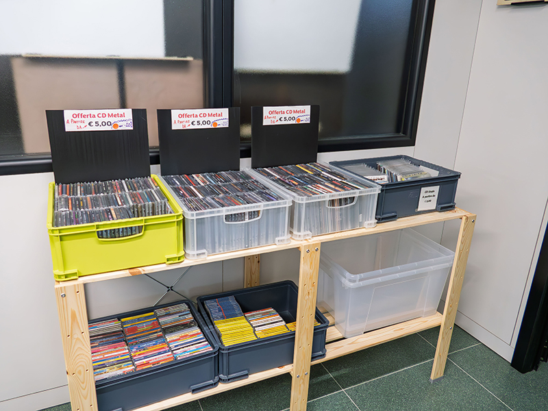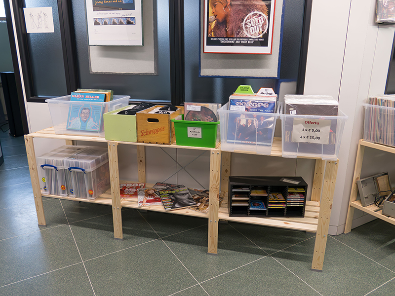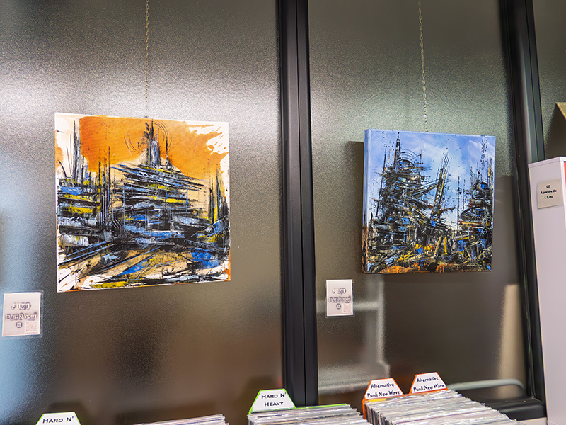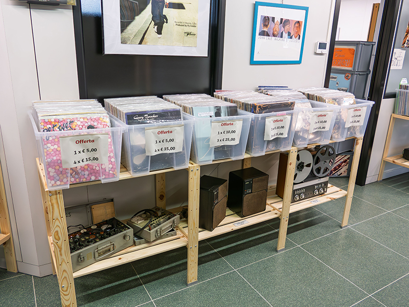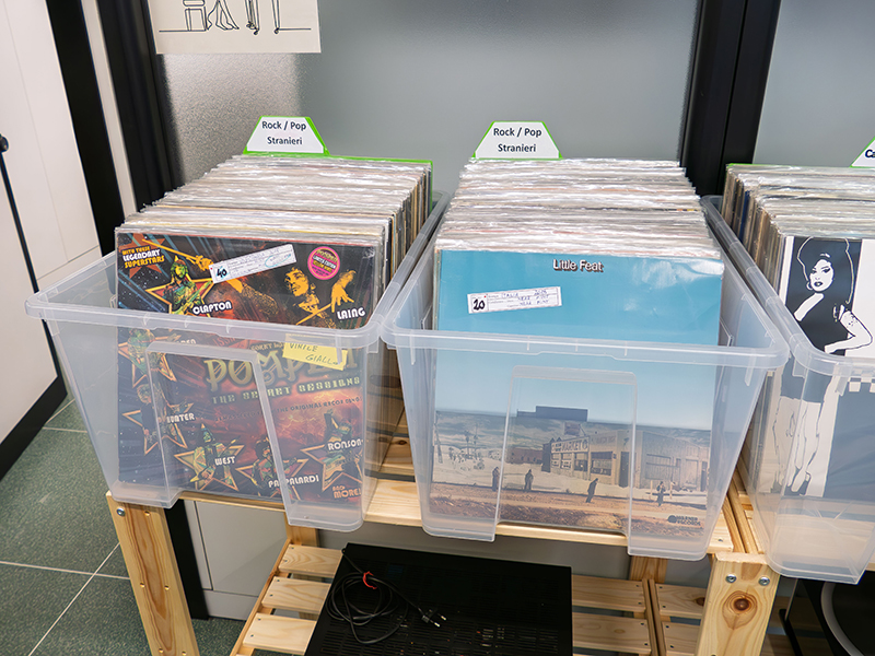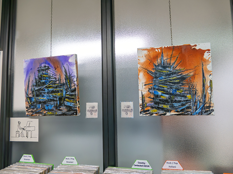Pur piacendogli un po' di tutto, ci sono cose che ovviamente Lorenzo Prato conosce meglio e quindi può proporre più agevolmente di altre che frequenta meno. Il suo genere preferito rimane il jazz, seguono il rock, la classica, mentre, anche per un fatto d'età, ha minor dimestichezza con la musica più moderna, come l'alternativa, metal e dance. Il desiderio di aggiornarsi è comunque costantemente presente nella sua attività, tenuto vivo grazie anche allo scambio con i ragazzi e tutte le persone che frequentano questi spazi. Tante volte capita che invece di essere lui a dare spiegazioni, sono i clienti che al contrario le danno a lui su certe cose. Va da sé che non si può sapere tutto, ma l'importante è conservare l'apertura mentale verso il nuovo, un approccio che invita a guardare incessantemente al futuro. Appena si riuscirà a inquadrare, a ingranare bene l'attività, si potranno organizzare con cognizione di causa pure dei piccoli eventi culturali. Noto appesi alle pareti dei quadri, sono di un artista della zona, anche lui appassionato e grande esperto di musica, si chiama Jimi Gazzosa. Sono dipinti che Lorenzo mette nella categoria dell'impressionismo post-industriale. Non viene esclusa dal novero dei suoi interessi culturali l'arte pittorica, oggi rappresentata nel negozio da un artista che ritiene molto molto bravo, qui c'è una sua piccola personale e la domenica precedente alla mia visita è stato realizzato un evento a Rho, dove si univano arte visiva e musica.