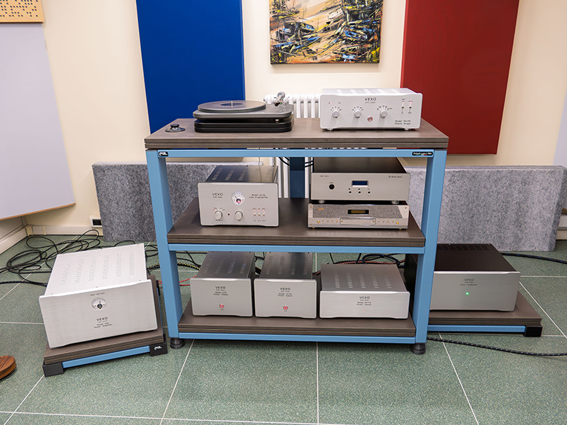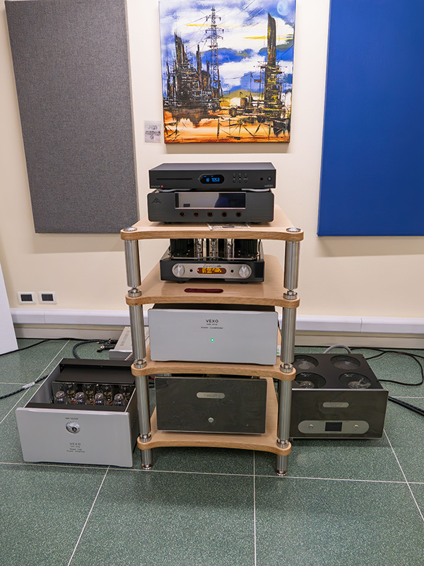 Sul versante sorgenti segnaliamo la presenza del giradischi Thales TTT-Slim II, con braccio Thales Easy e testina EMT JSD Pure Black, lettore CD AVM Evolution CD 1 e convertitore D/A Gaudio Sound GS 1.1. Tutte Vexo le amplificazioni: preamplificatore linea LP-PS, preamplificatore Phono PH-PS e il citato amplificatore finale di potenza stereo S20 (ognuno con la sua alimentazione separata), completa la dotazione il filtro di rete Power Conditioner, indispensabile per esaltare la qualità sonora di un impianto talmente avanzato. L'amplificatore di potenza era il Vexo S20 è il più piccolo prodotto dal marchio, erogando solo 15 Watt. Un Push-Pull di 2A3 con feedback negativo zero, completamente bilanciato e privo di circuiti integrati, eroga una potenza che si potrebbe ritenere esigua, se non insufficiente, per due bestioni come le Sigma Acoustic Orchestra 2.9, peccato che queste vantino una sensibilità di ben 95 dB e sono risultate tranquillamente pilotabili dall'S20, anche se personalmente ritengo che qualche Watt in più avrebbe aiutato le basse frequenze a esprimersi con più energia. Tutta la cavetteria era DH Lab, un marchio americano trattato dalla Gaudio Sound. Dall'impianto acceso e non ancora sottoposto ad alcuno stimolo musicale filtrava un silenzio assoluto, merito certamente anche del Power Conditioner Vexo.