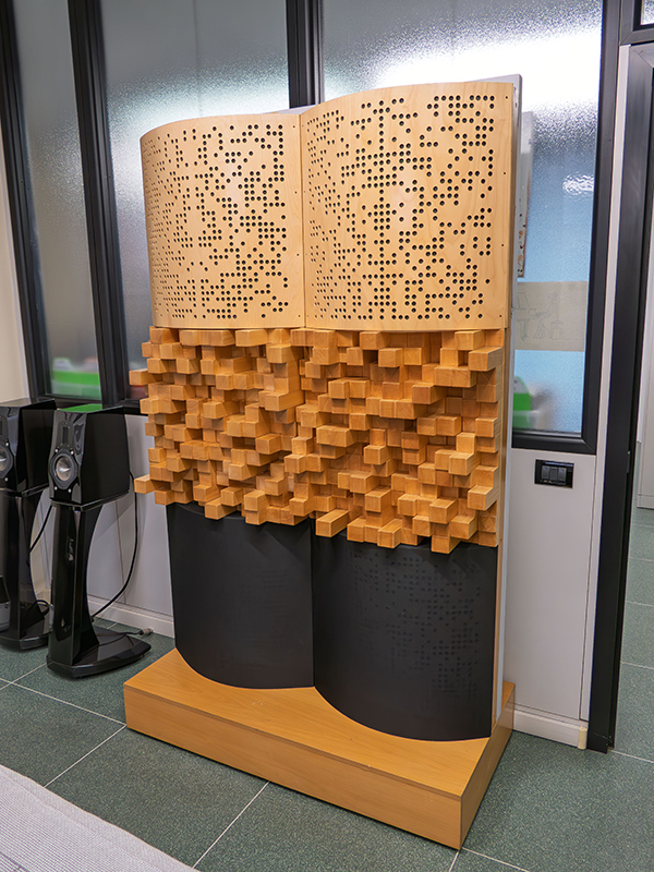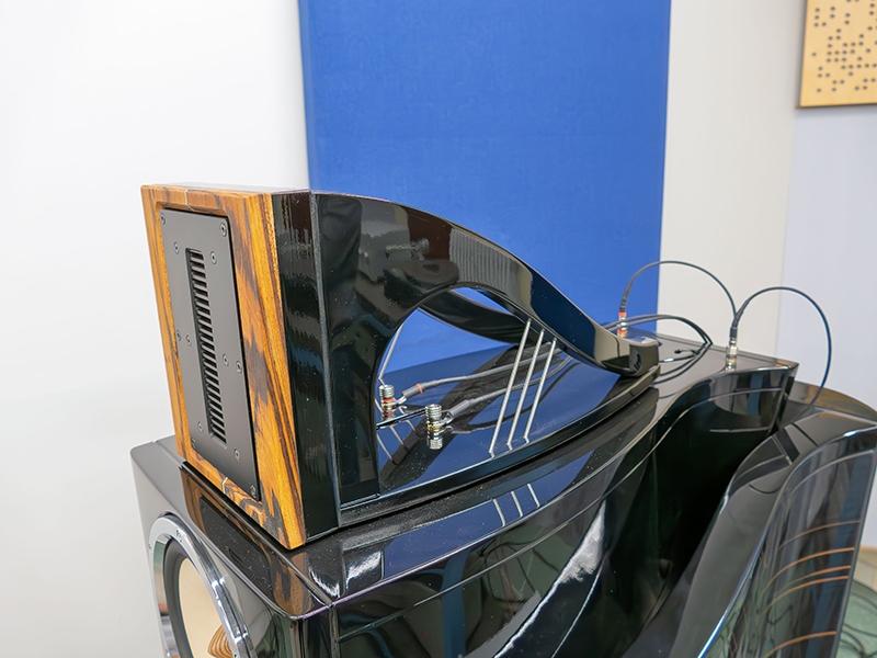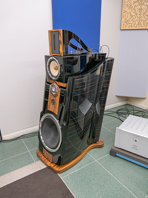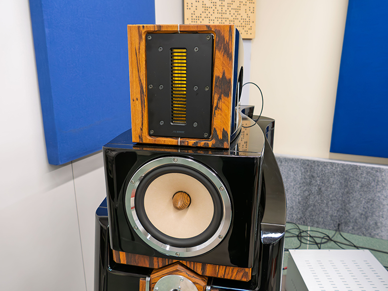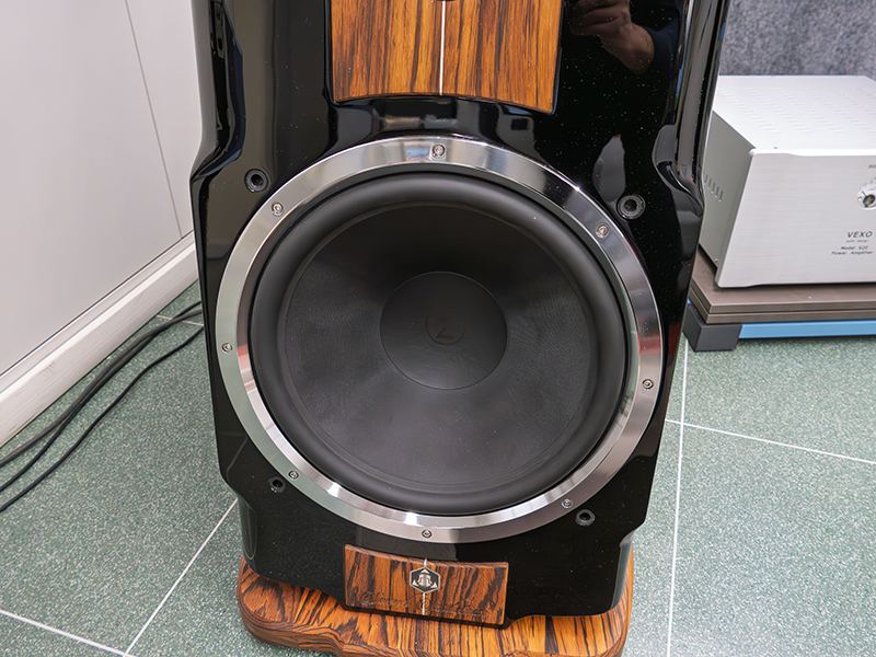 Oltre al midrange, del quale abbiamo già parlato, c'è un grande woofer da 42 cm (16,5″) in fibra di vetro con porta accordata, un tweeter del tipo AMT (Air Motion Transformer) in Kapton Neodimio con allineamento temporale regolabile sul quale vale la pena soffermarsi un po'. Parliamo di un sofisticato trasduttore caratterizzato dal suo esclusivo diaframma piegato a fisarmonica. Inventato dal fisico tedesco Oskar Heil negli anni '60, questo componente sposta l'aria secondo un principio fisico diverso rispetto ai classici altoparlanti a cupola o a cono. A differenza di questi, che si muovono avanti e indietro come un pistone, l'AMT è basato su una sottile membrana in polietilene o poliammide, spesso in Kapton come il nostro, ripiegata su se stessa. L'emissione è dunque a "soffietto" poiché quando il segnale elettrico attraversa i conduttori in alluminio stampati sulla membrana, tali pieghe si stringono e si allargano "spremendo" l'aria fuori da esse e, particolare importante, a una velocità fino a cinque volte superiore a quella del movimento della membrana stessa. La superficie radiante, inoltre, grazie alla struttura ripiegata ha una grande estensione rispetto allo spazio effettivamente occupato. La potenza consigliata per questi diffusori va da un minimo di 15 Watt (esattamente quelli che eroga il finale Vexo S20) a un massimo di 500 Watt.