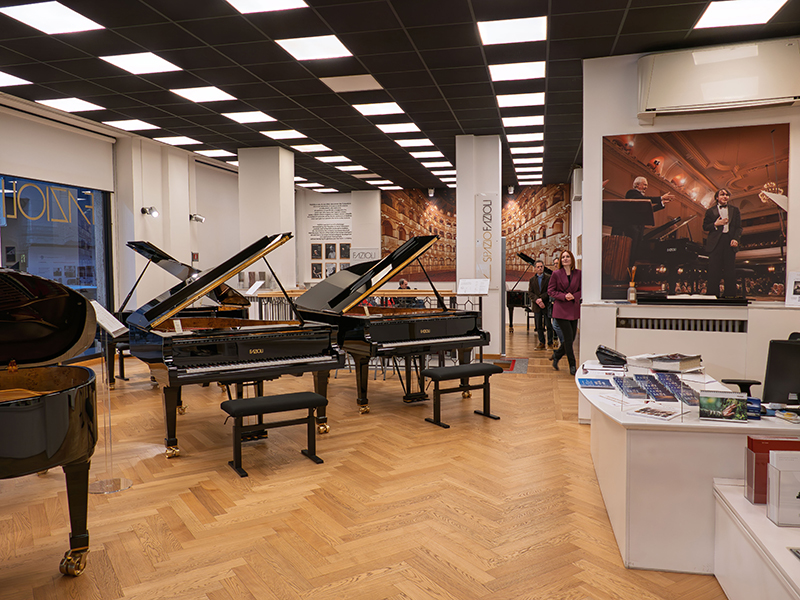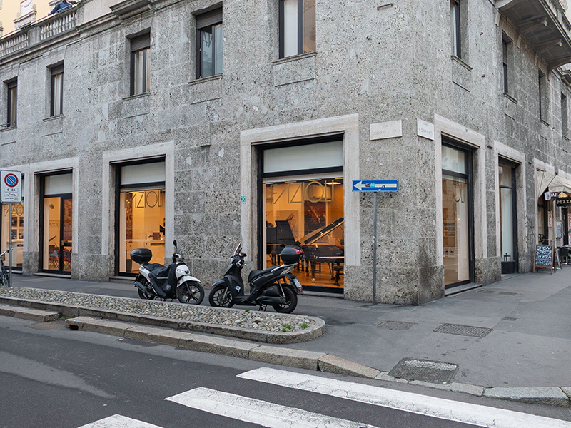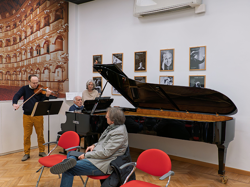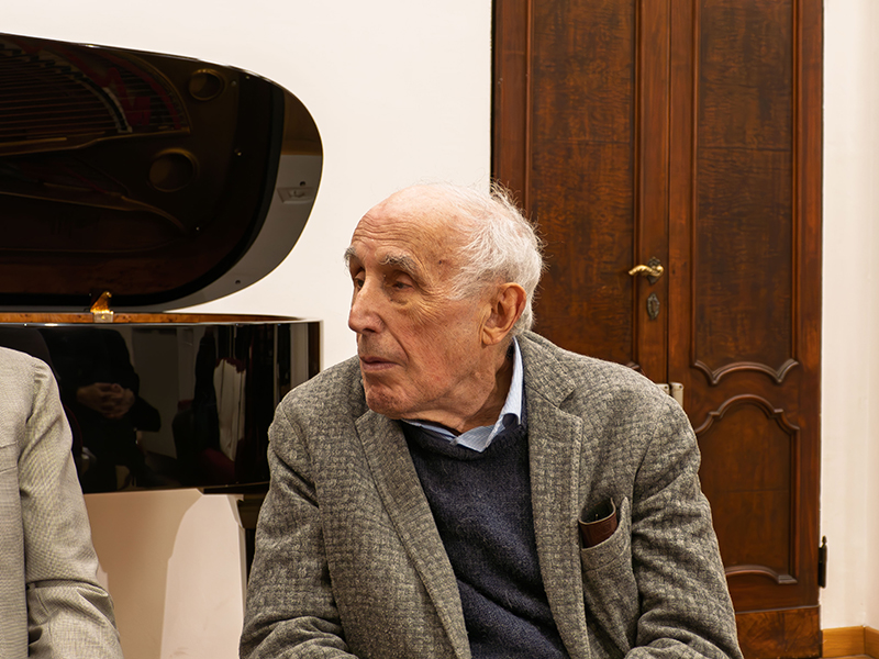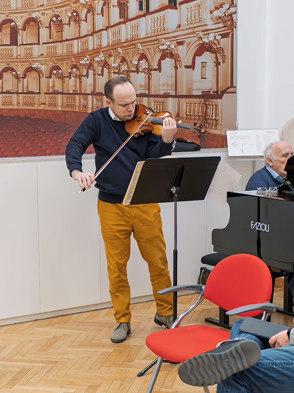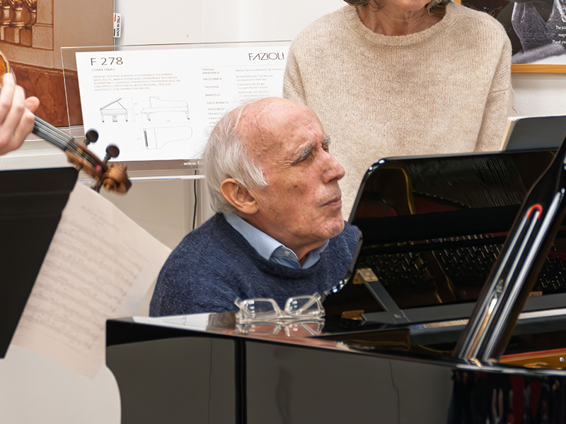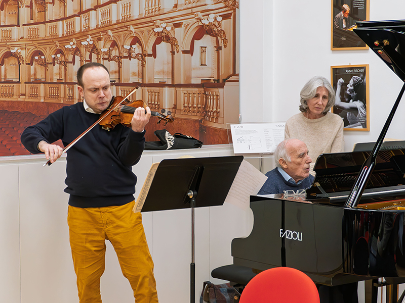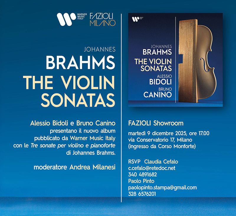 Ruit hora. È trascorso molto tempo dalla mia precedente visita allo Showroom Fazioli di Milano, il prestigioso spazio sito a due passi dal Conservatorio, non molto distante dal Teatro alla Scala e dal centro della città. C'ero stato il 4 ottobre 2018, in occasione della presentazione del 31° Concorso Pianistico Internazionale "Antonio Casagrande". Otto anni quindi, un lasso di tempo sufficiente a deformare i contorni mnemonici di quanto vissuto e farmi vedere diversamente la realtà di oggi: se il luogo è rimasto il medesimo, sono io a essere cambiato in questi anni. Per questo il giorno 9 dicembre U.S. ho varcato con rinnovata emozione la soglia dello storico negozio che dal 1919 è un punto di riferimento per studenti, professionisti e appassionati di musica. La sede, che sarebbe riduttivo considerare solo come punto vendita, è stata tempo fa rinnovata su progetto dell'architetto Domenico Fazioli, con lo scopo d'incarnare la qualità e la filosofia dell'azienda. Un luogo anche di arte, con un'area espositiva di 180 metri quadri, dove si sono esibiti e continuano a esibirsi eminenti personaggi del mondo musicale. Proprio come quelli di stasera: il violinista Alessio Bidoli e il pianista Bruno Canino, protagonisti dell'evento di presentazione del loro nuovo CD "Johannes Brahms - The Violin Sonatas".