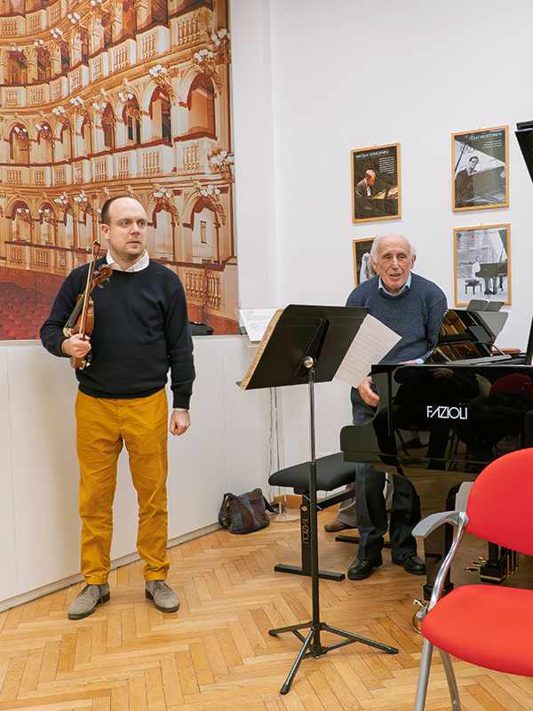 Da evitare suonando queste opere è quel protagonismo talvolta tipico dell'interprete, dove il pianoforte come detto assume una dimensione non meno importante di quella del violino. Il notevole volume sonoro, proprio dello strumento a tastiera, se non ben governato può portare a uno sbilanciamento, a questo bisogna stare attenti durante l'esecuzione, anche se può più facilmente accadere in opere come i quartetti con pianoforte o nel quintetto. "Dal canto suo il pianoforte non deve tirarsi troppo indietro", dice Canino, "cosa che io forse faccio in modo eccessivo." Ma, si sa, con il tempo cambiano i costumi, anche quelli della musica. Particolarmente arduo risulta il tempo lento dell'Op. 108, l'Adagio. C'è poi da fare un'importante distinzione tra violino e pianoforte, poiché Bidoli suona il suo, che è sempre quello, mentre Canino per forza di cose deve adattarsi a quanto gli viene offerto. "Avrei dovuto prendere certe misure su questo gran coda Fazioli, per valutare il volume che riesce a esprimere, la resistenza che oppongono i suoi tasti, ma non ho potuto farlo". Un magnifico Fazioli gran coda del 1996 apparso in gran spolvero, restaurato l'anno scorso in fabbrica. Ma quanto conta la dimensione umana nel fare musica da camera?